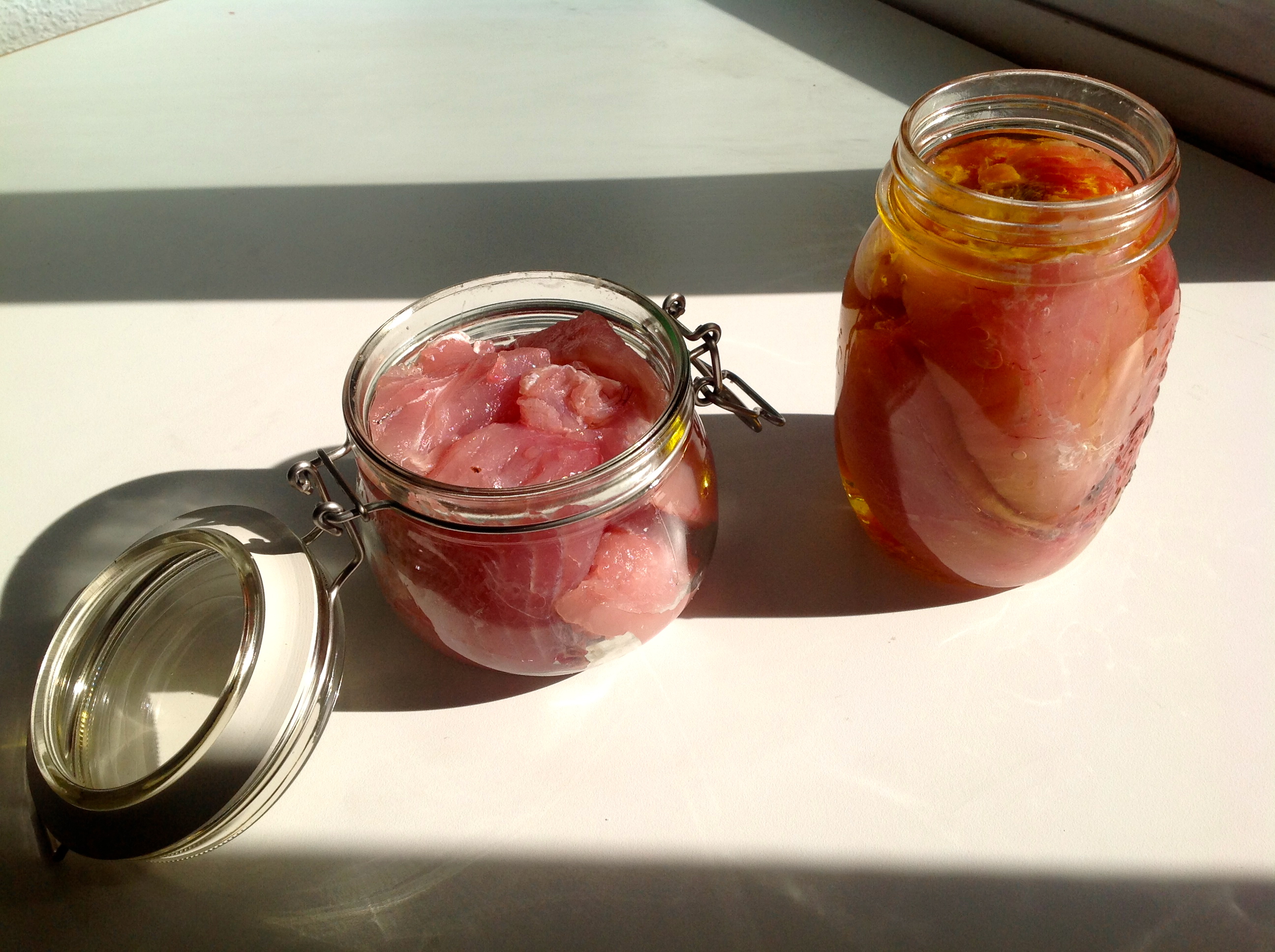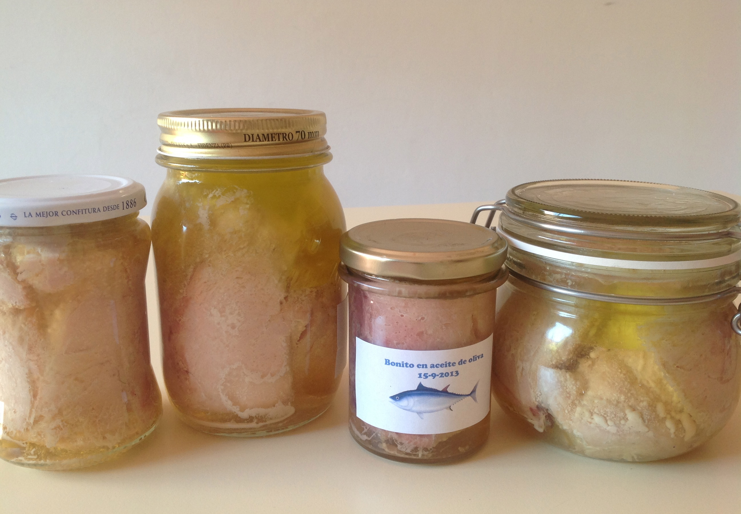 - 250 cc de aceite de oliva de 0’4 grados de acidez. El aceite de oliva virgen extra es demasiado fuerte y oscurece la carne del bonito, acidificando la conserva.
