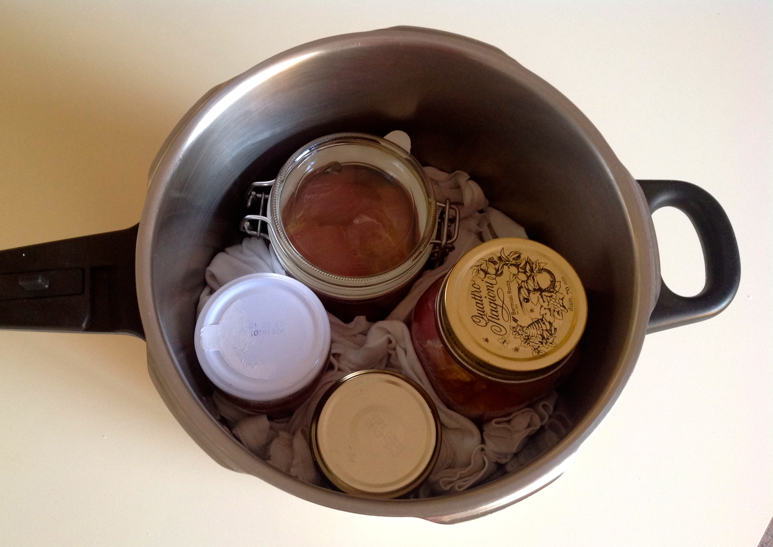 - Colocar un difusor en el fondo de la olla o un paño doblado. Envolver los tarros con paños para que no se rompan si se chocan entre sí durante la cocción.
