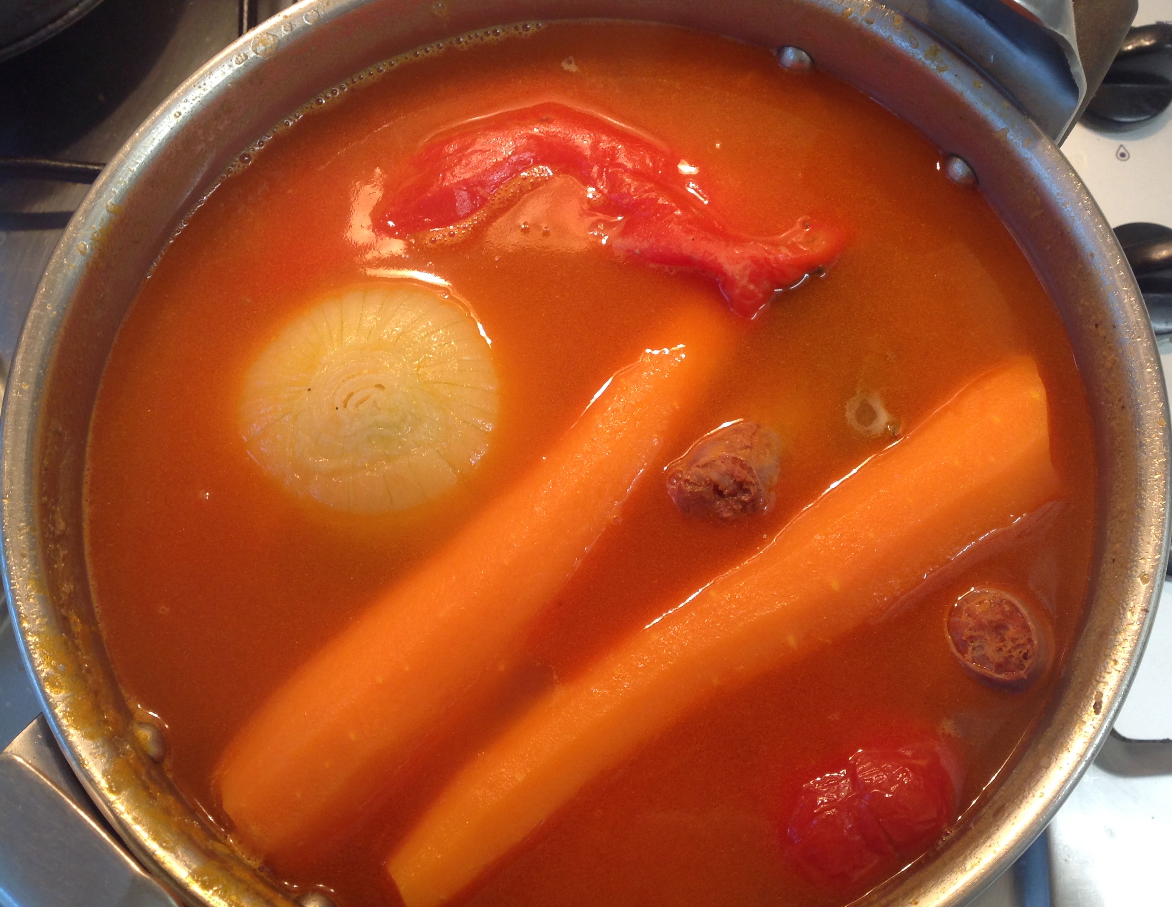 - Incorporar el chorizo, el jamón, los ajos enteros y el resto de verduras sin piel.
