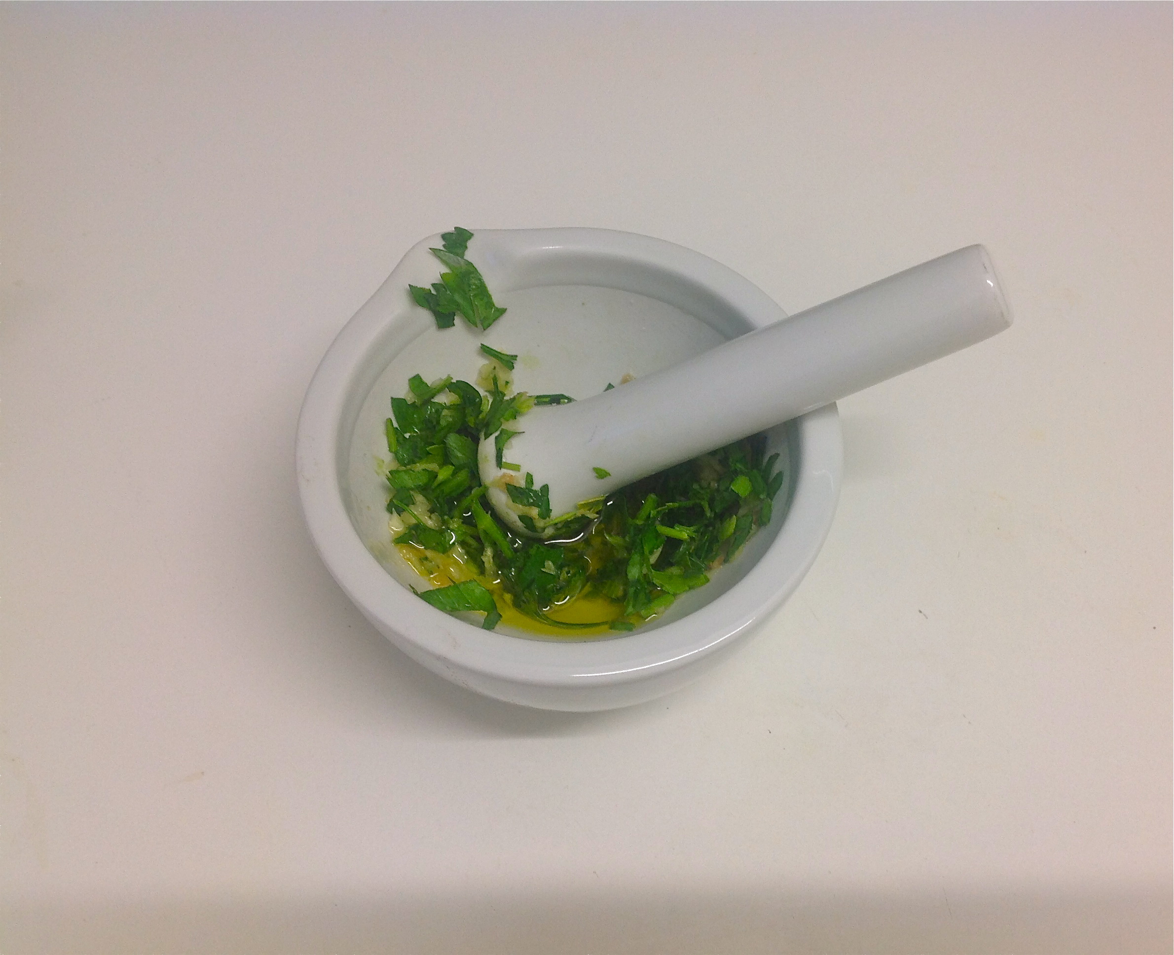 - Mientras tanto, poner un poco de sal en un mortero, añadir los ajos y aplastarlos. Añadir el perejil picado por encima y majar con la mano del mortero hasta que se haga una pasta.