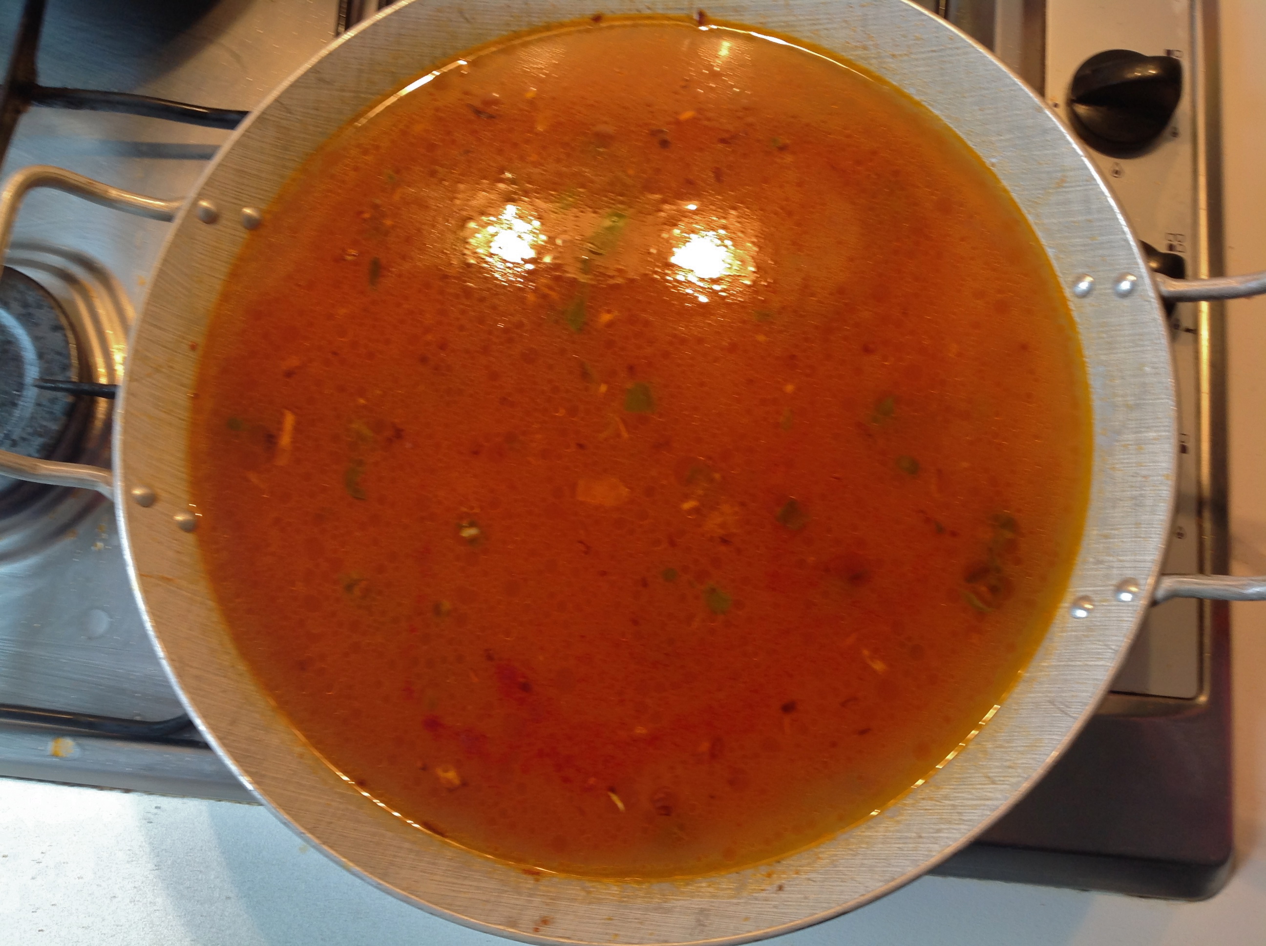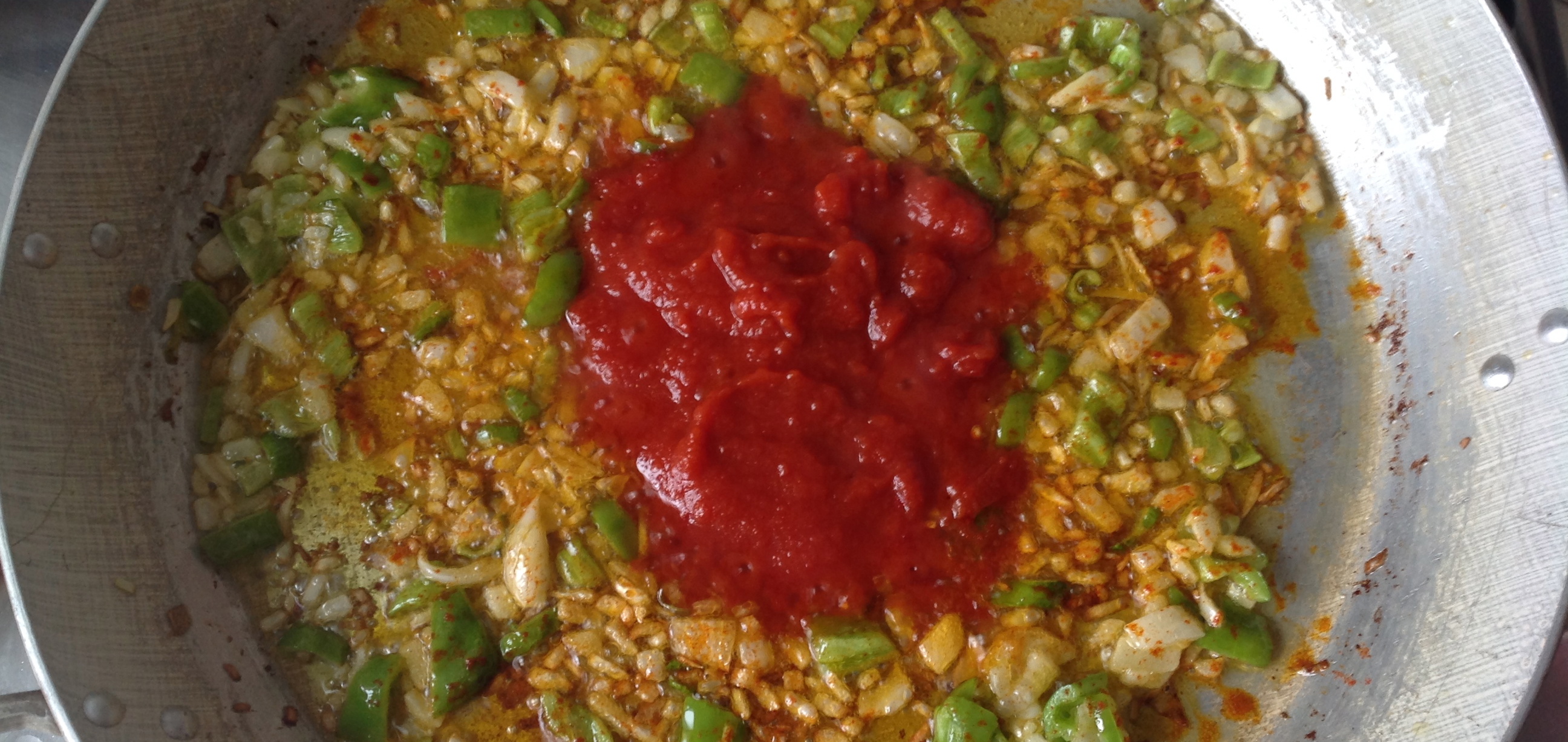 - Cuando esté la cebolla transparente añadir la salsa de tomate y el caldo, la medida es hasta que llegue a los remaches inferiores de las asas de la paella. Añadir algo de agua o más caldo si hace falta.