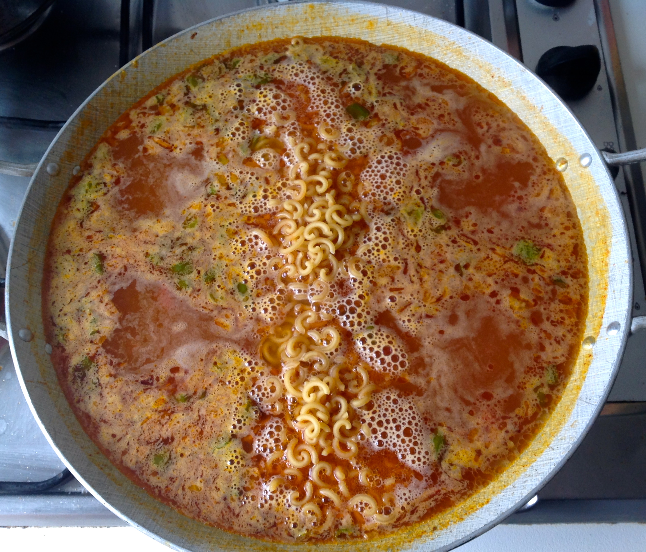 - Diluir el azafrán y la sal si no se ha echado cubito de caldo. Cuando empiece a hervir, añadir los fideos. La cantidad, según me enseñó una valenciana para el arroz de las paellas, es trazar el diámetro de la paella con el arroz (en este caso, los fideos) y luego repartirlo por la paella.