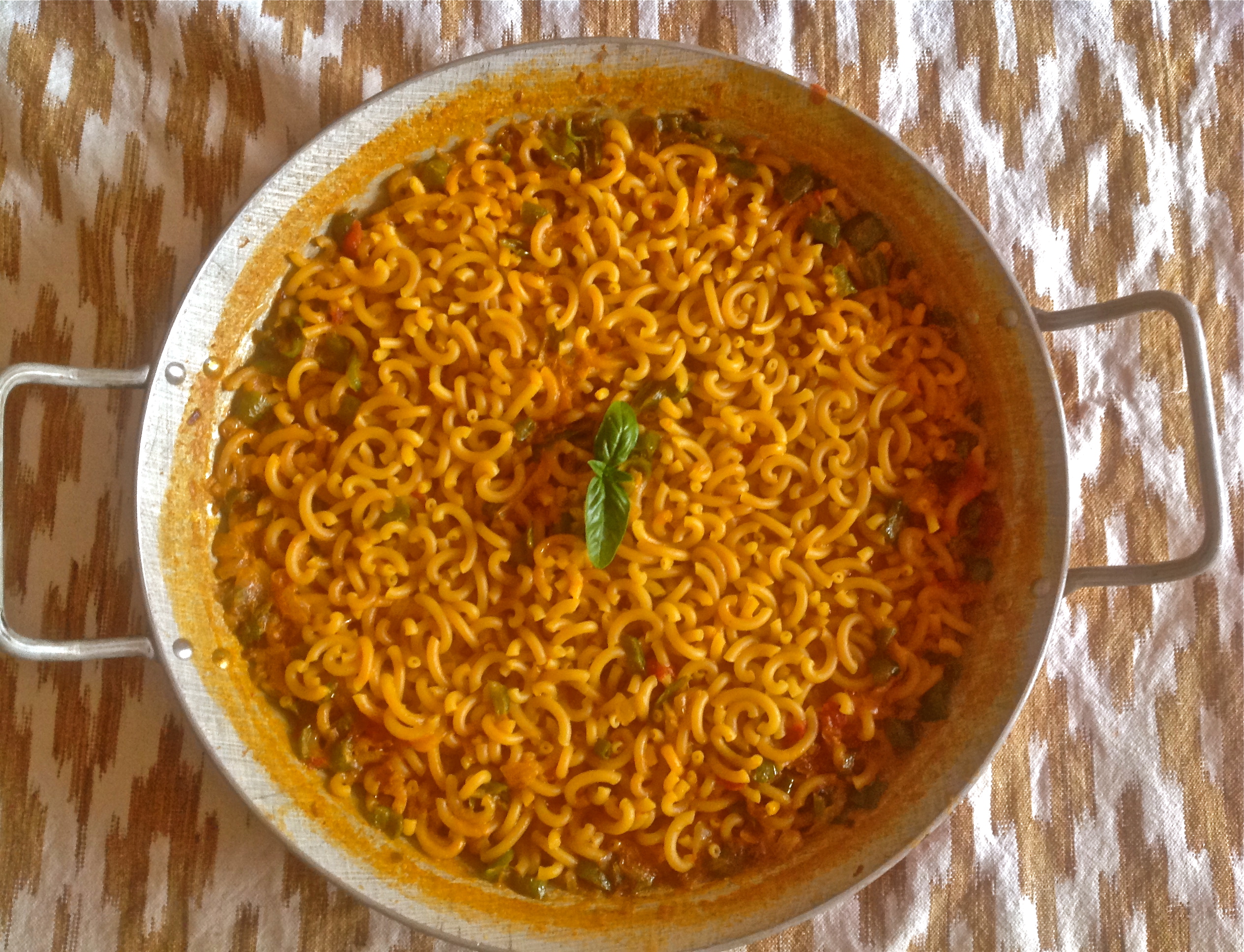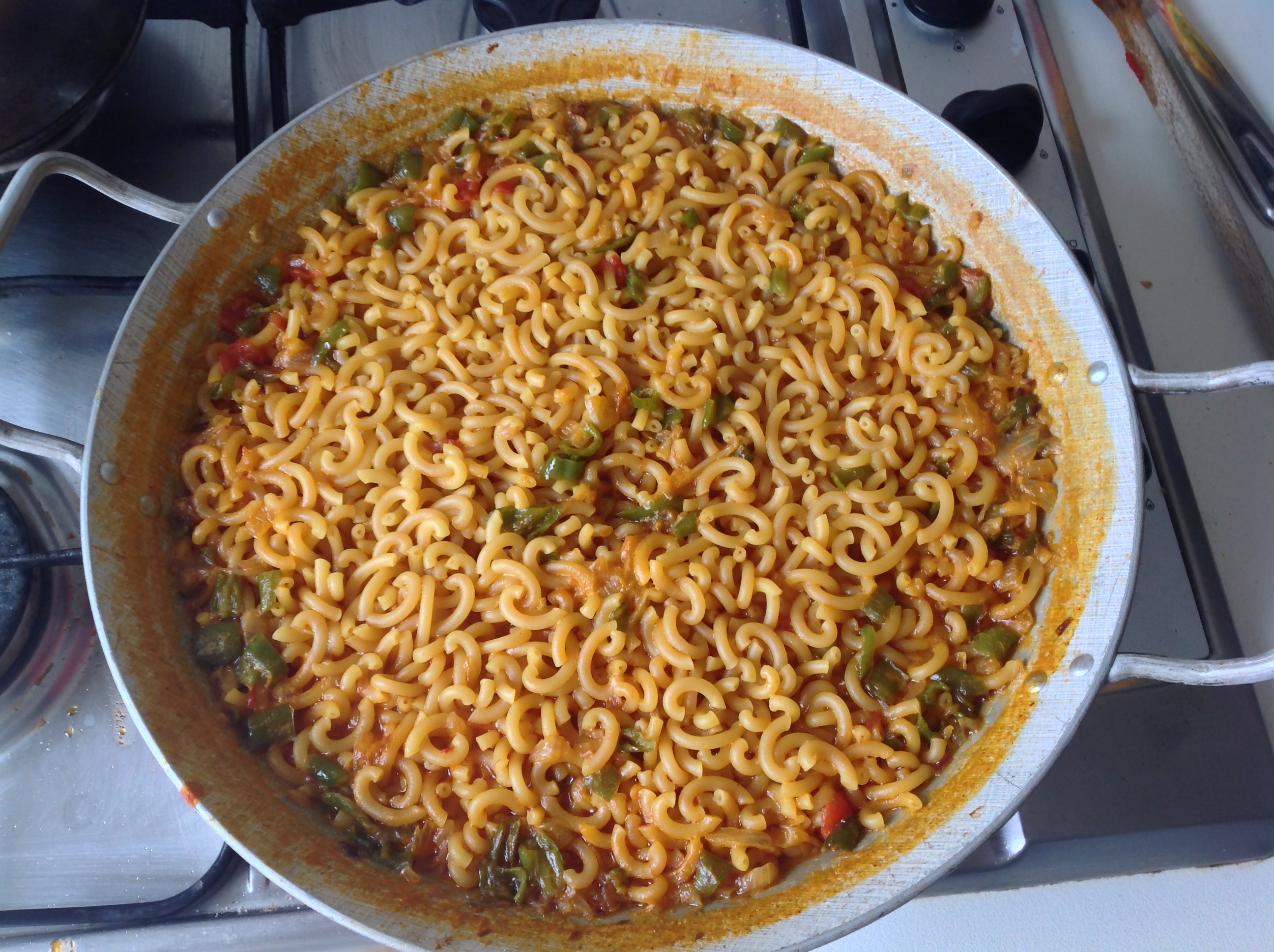 - Dejarlo hervir a fuego vivo 8 minutos o 6 minutos si gusta la pasta más entera. Aún así, quedará caldo en la base de la paella. Dejar que la pasta absorba el caldo restante con el fuego apagado y cubriéndola con papel de aluminio o con una tapadera grande.
