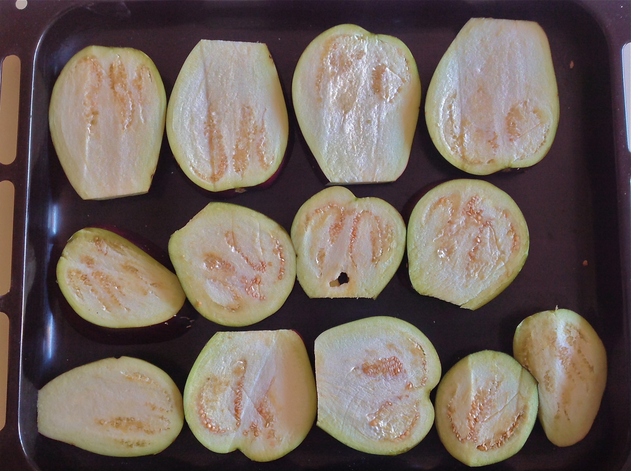 - Secar las berenjenas con papel de cocina y poner la mitad en una bandeja de horno y rociarlas ligeramente con aceite. Gratinarlas hasta que se doren (unos 15-20 minutos, dependiendo del tamaño).