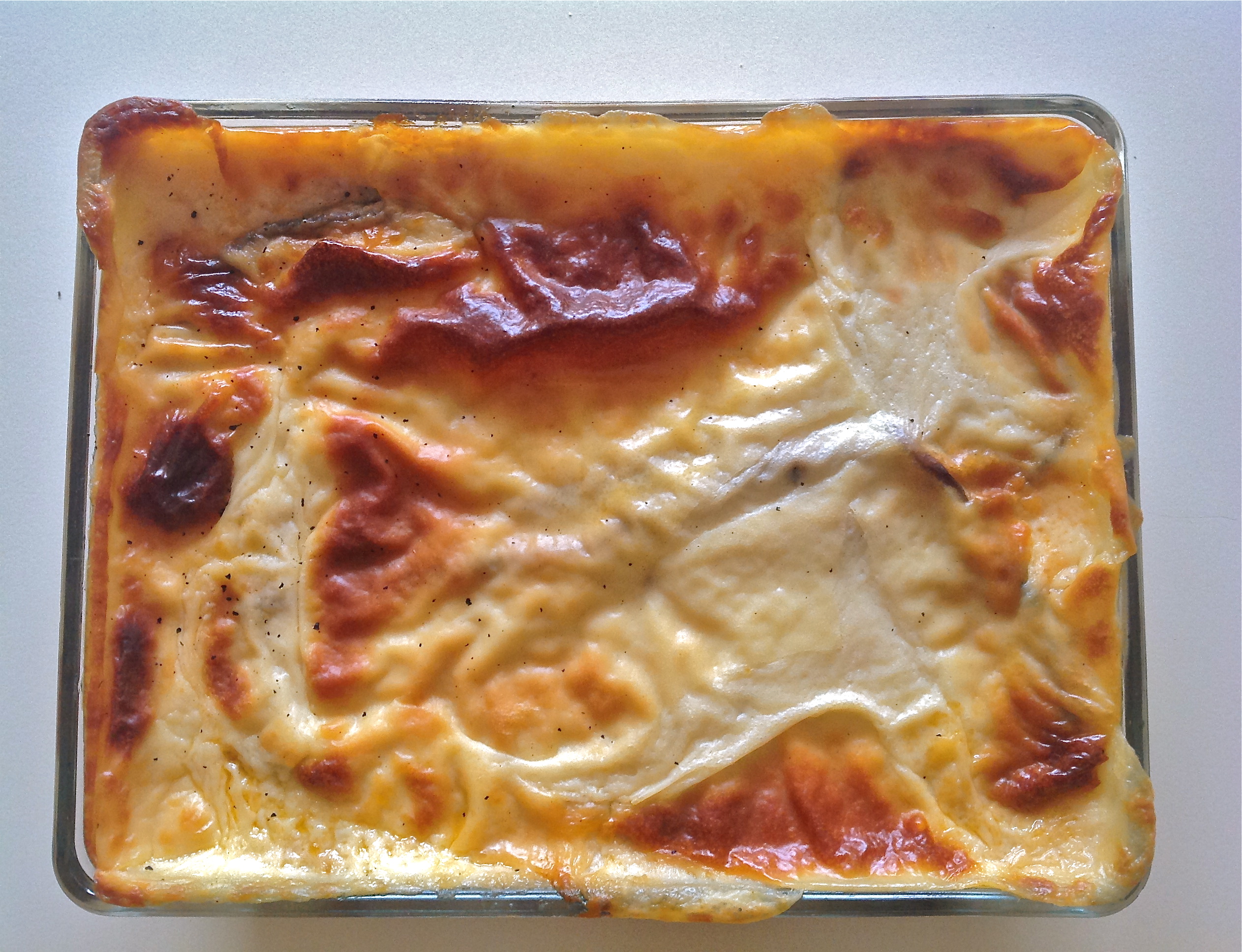 - Verter la bechamel por encima y hornear a 150 ºC durante 45 minutos o hasta que se dore.