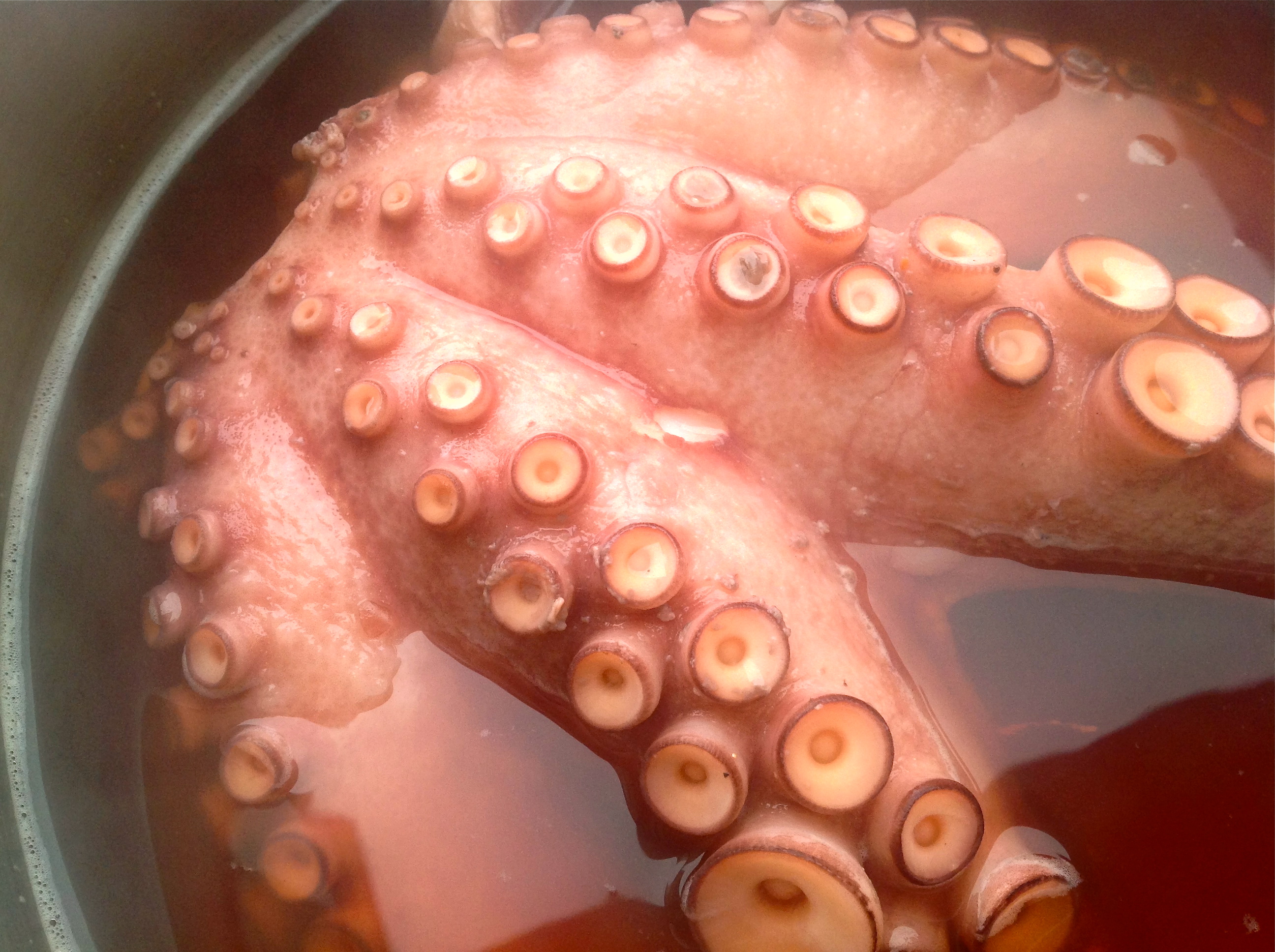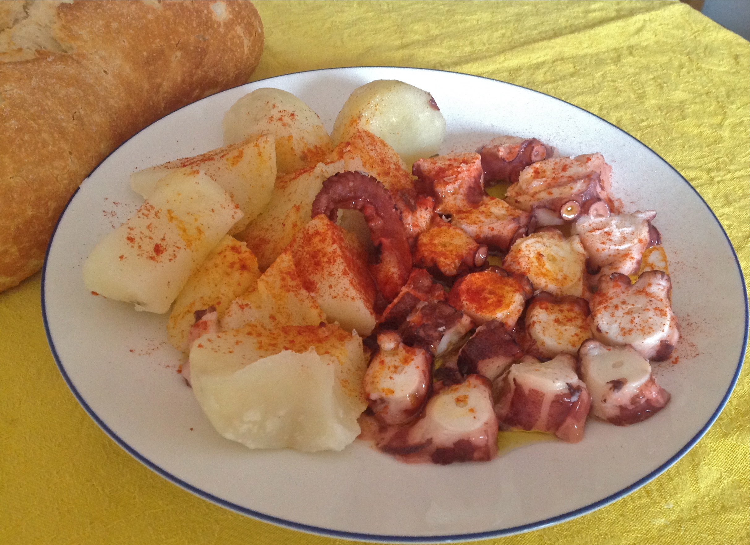Pues cada vez que consigo un pulpo bueno vuelvo a pararme en aquella taberna callejera. Si tengo cachelos auténticos (los quenebec son los mejores, insistía mi gallega Mercedes) y cierro los ojos, casi oigo a los peregrinos junto al río. Porque después de cocinar unos cuantos pulpos duros, o salados, o sospechosamente elásticos, mi amiga Pilar trajo uno a casa que cambió los resultados. Y es que el pulpo se cuece SIN SAL, como lo oyes. Las leyendas de que debe cocerse en agua de mar no funcionan aquí en la meseta, así que, siguiendo el consejo de nuestro maestro pescadero Juan Carlos, desde entonces cocemos el pulpo en agua fresca, pura y natural.