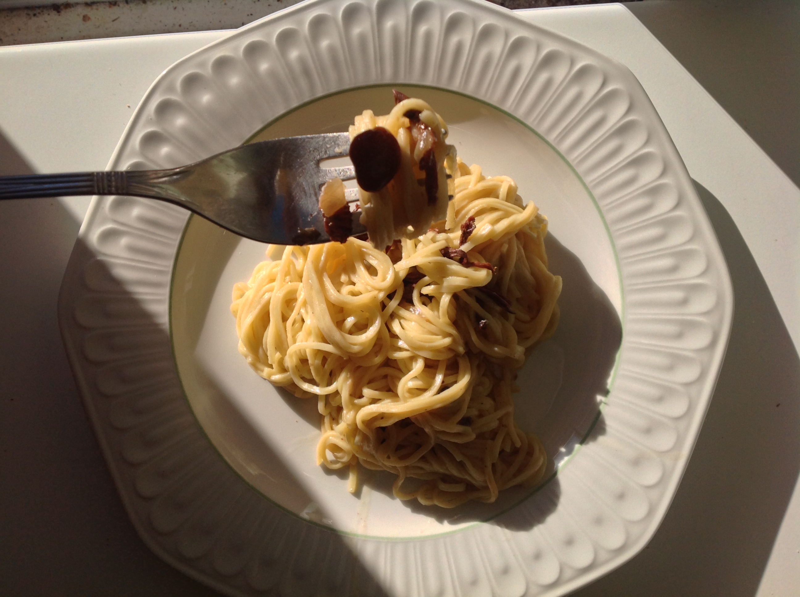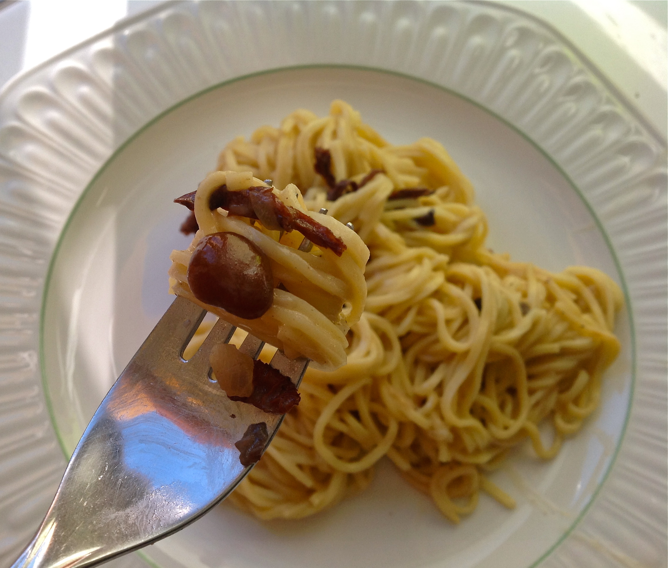 Pues vamos a intentar imitarlos con unos exclusivos y facilísimos espaguetis con setas. Puedes utilizar setas frescas, congeladas o secas, o una mezcla de todas. Si las has recogido tu mismo, pues qué te voy a decir, eso ya es una reliquia. Y si eres un apasionado de la pasta fresca que te preparas tu tallarines artesanalmente, ya no hay palabras. Para el resto de los mortales, que echan mano de la pasta seca de toda la vida (italiana, eso sí) y de las setas que venden en el súper del barrio, esta receta también resulta magnífica. El único problema es acabar con toda la cazuela de una vez. Aunque también los romanos tienen la solución para esto, según mis amigas: