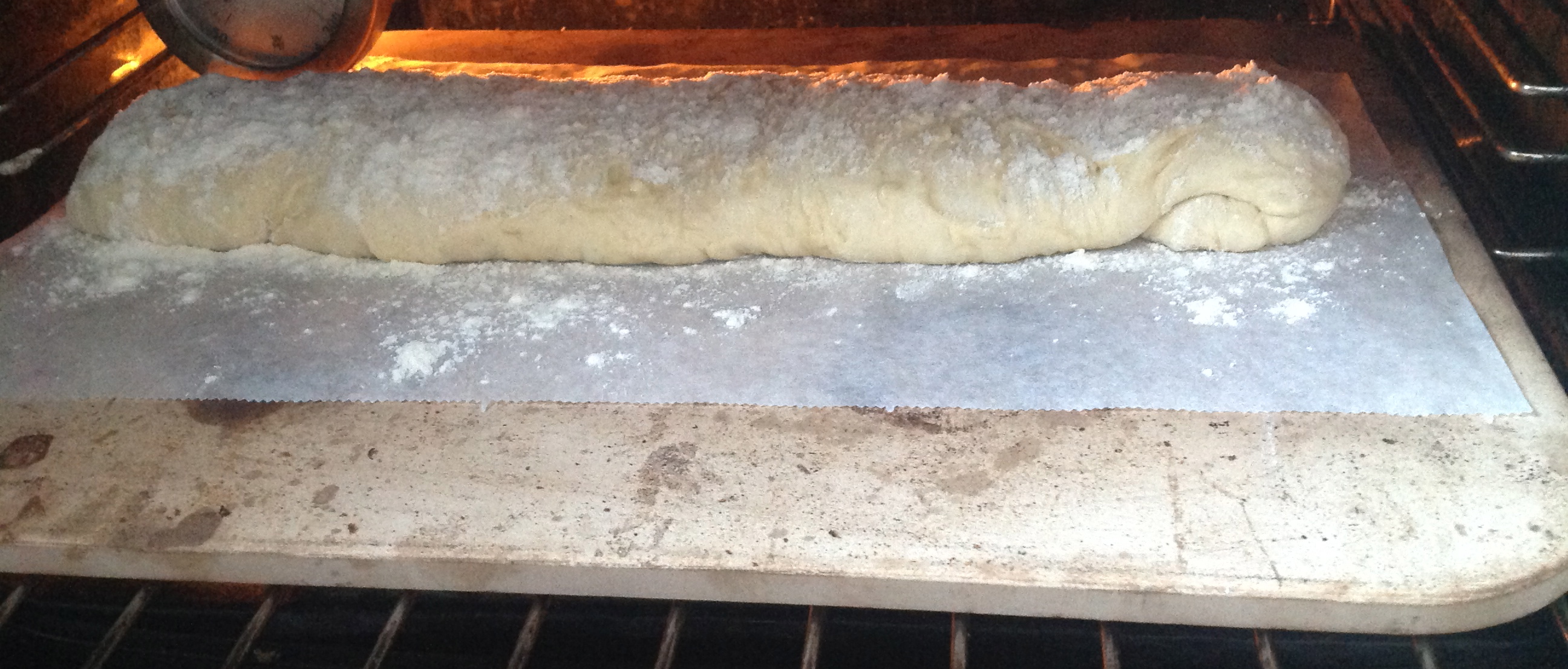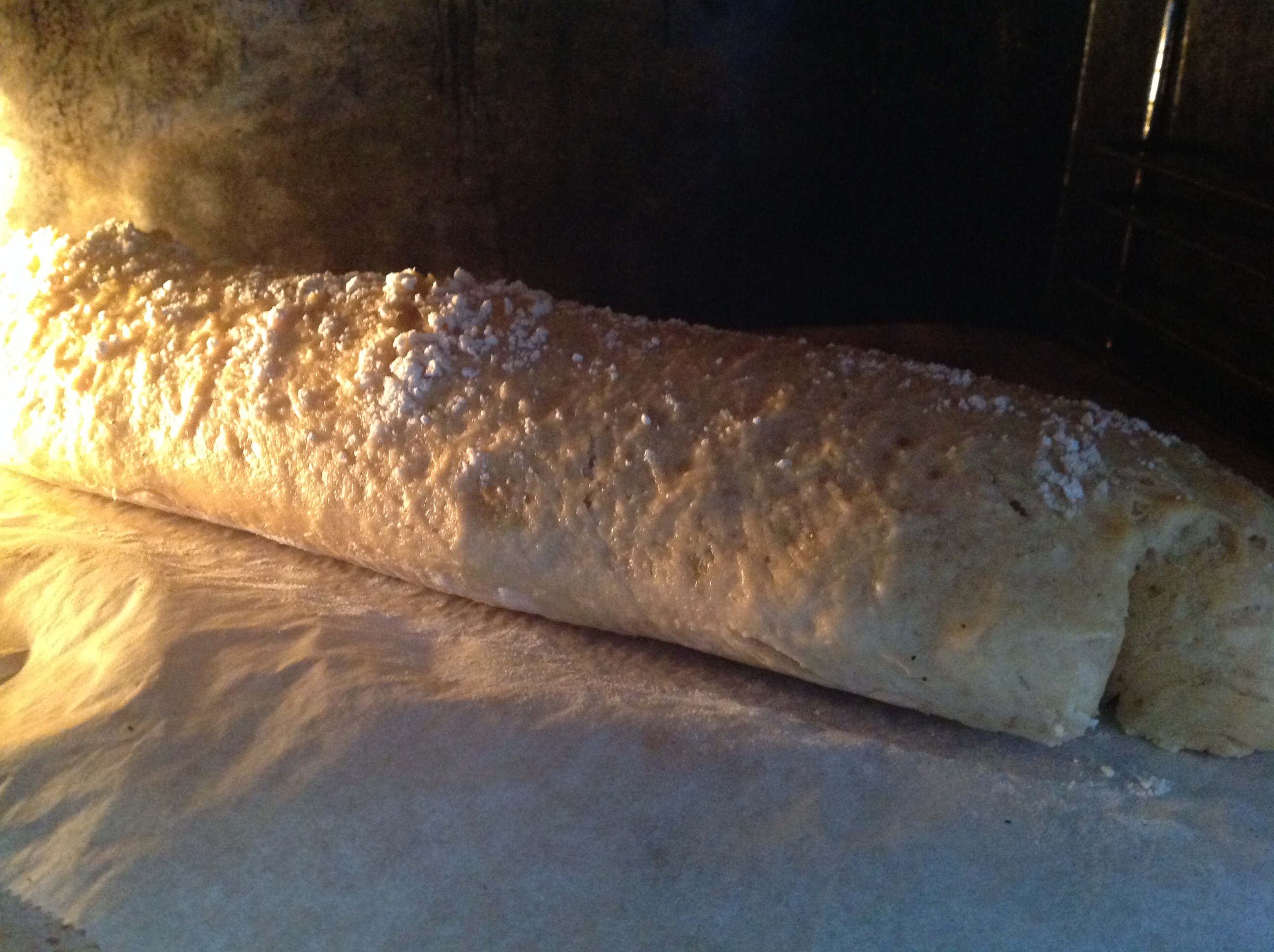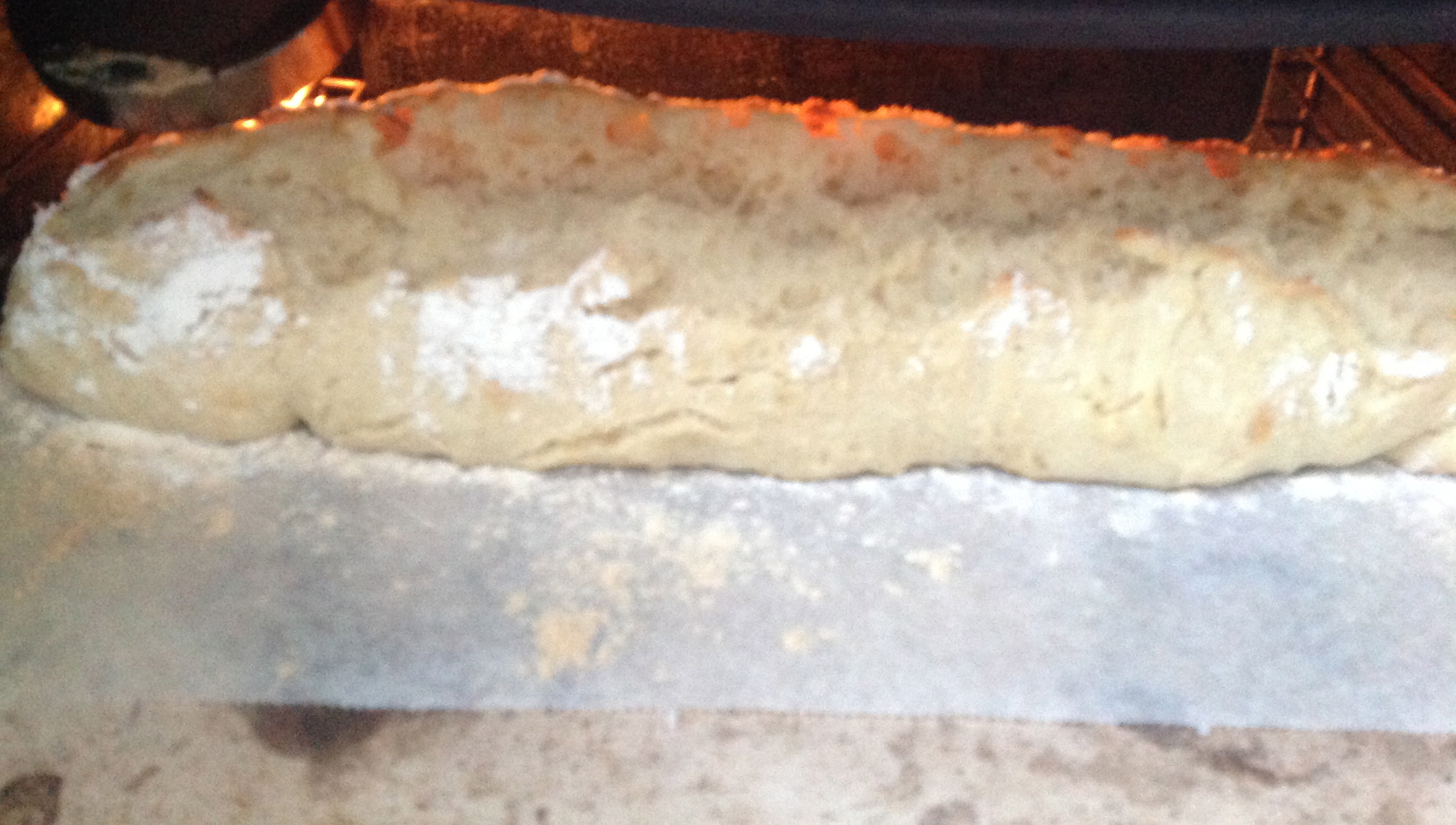 - Salpica harina por encima de la(s) pieza(s). Cuando el horno lleve al menos 30 minutos encendido y esté muy muy pero que muy caliente, introduce la bandeja con los panes: