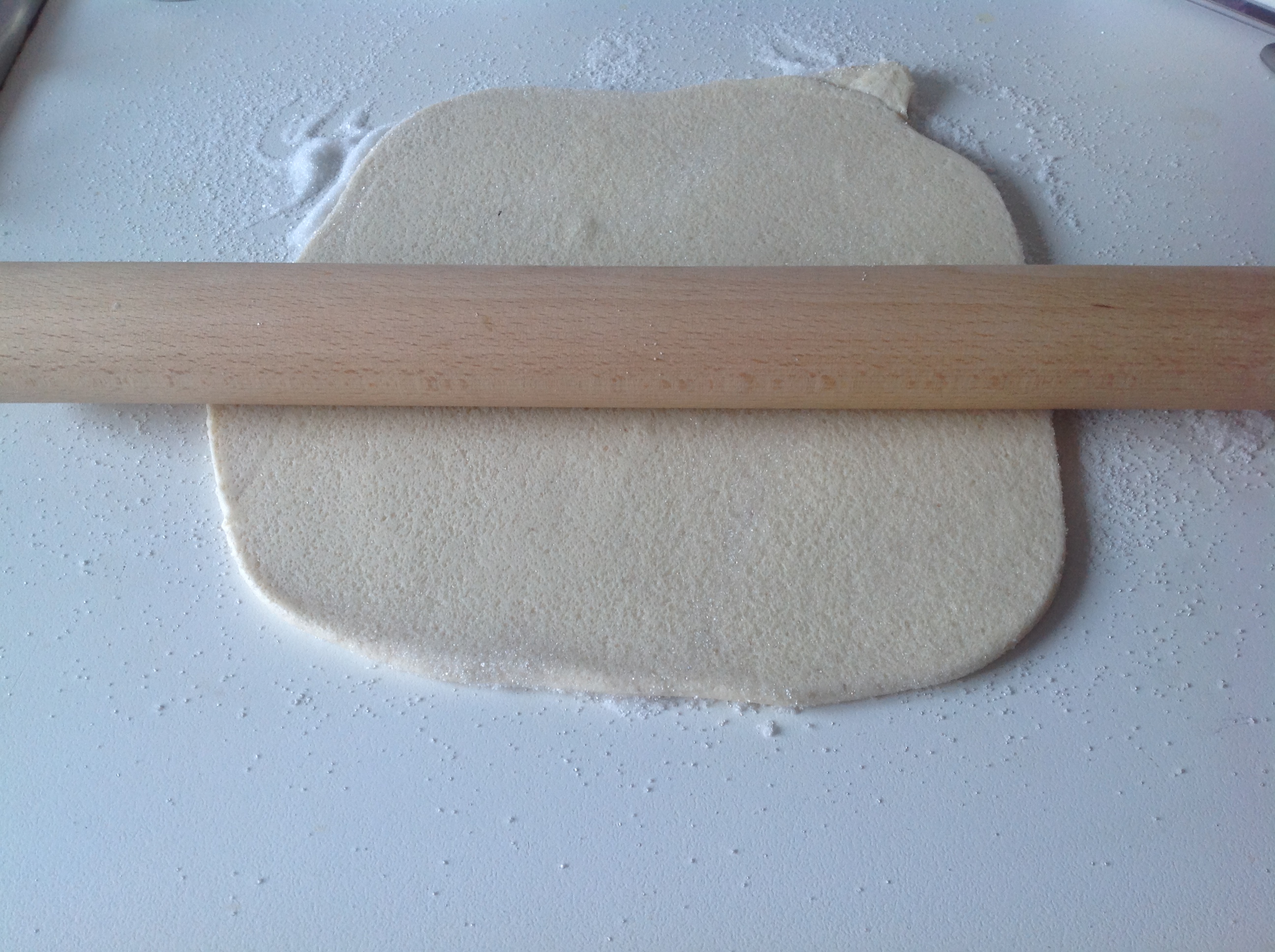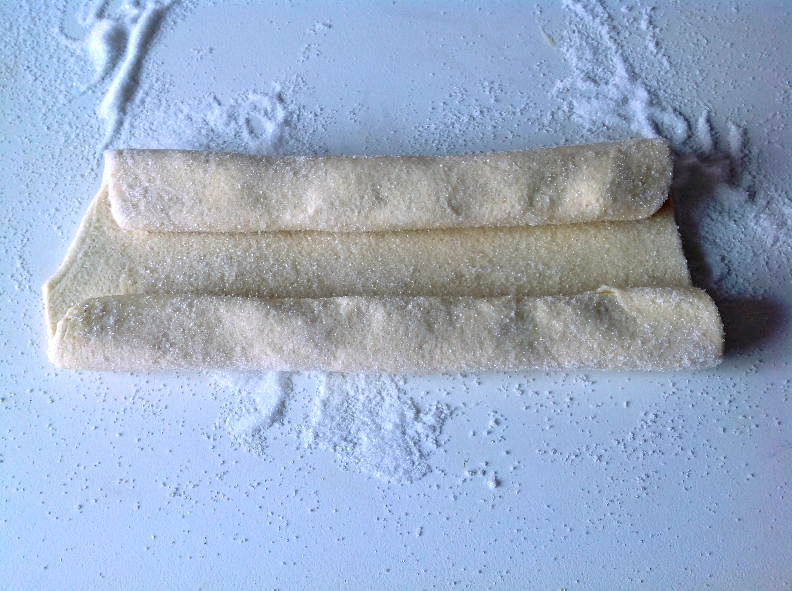- Espolvorear la mitad del azúcar en la mesa de trabajo y disponer encima la masa de hojaldre. Estirarla con el rodillo hasta obtener una lámina rectangular de unos 4 mm de espesor, si es que no está estirada o si has hecho la masa en casa, como fue mi caso: