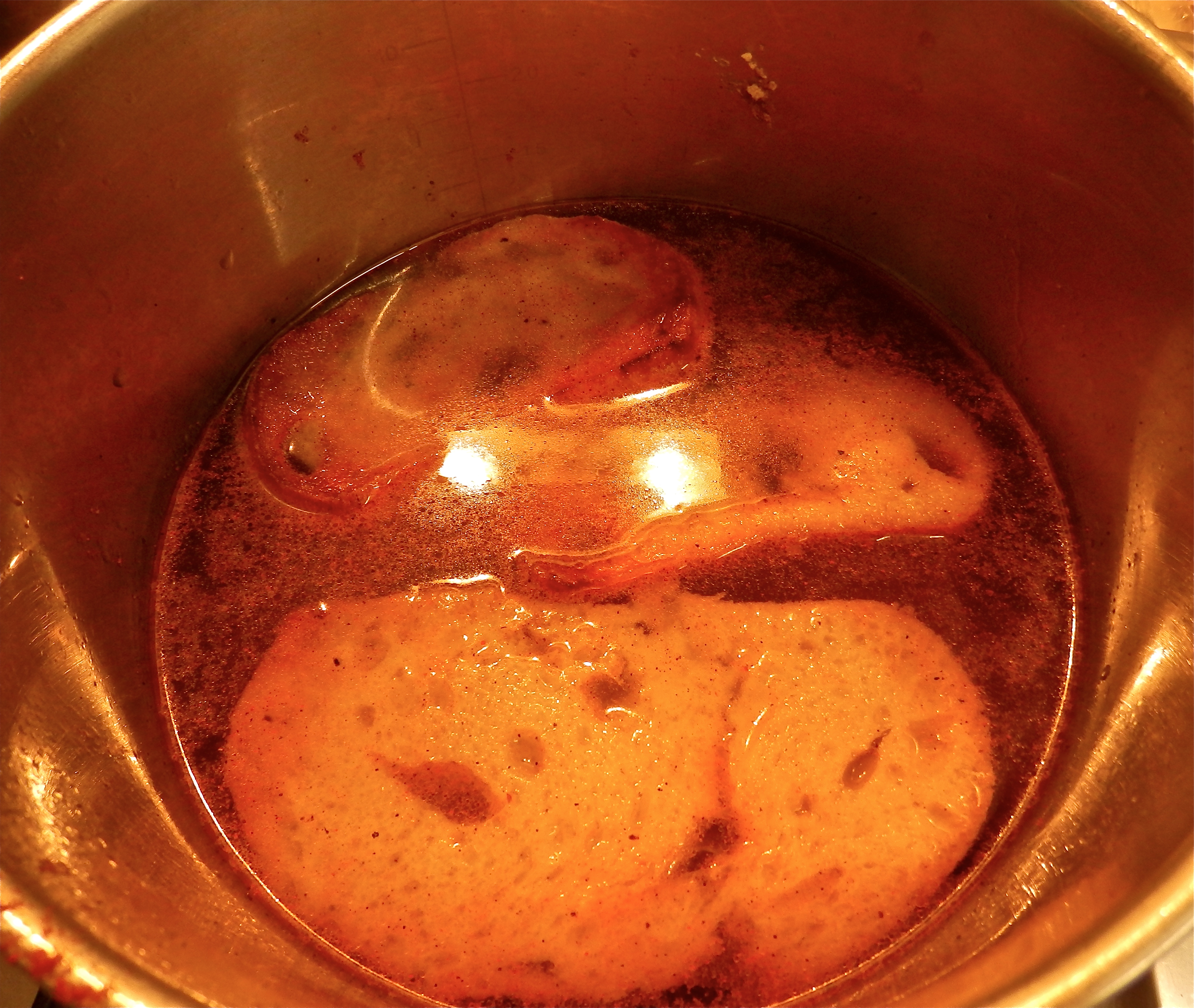 - Cuando empiecen a tomar color añadir las rebanadas de pan y darle vueltas para que absorban todo el aceite y se doren a su vez.