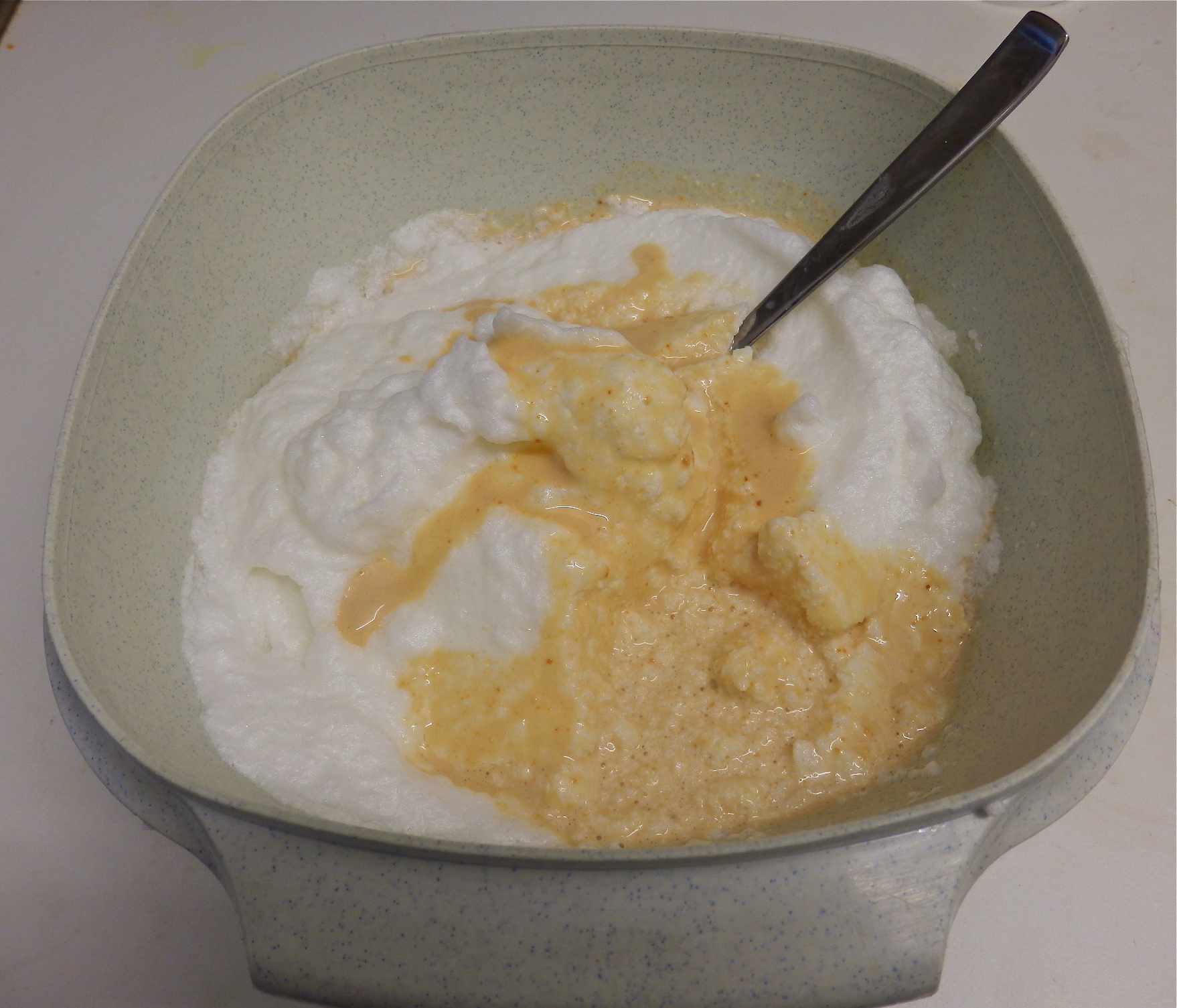 4. Mezclar la nata con la crema de turrón y una después incorporar la crema obtenida a las claras montadas. Para hacer esta mezcla sin desmontar las claras, envolver la masa con una cuchara metálica repetidamente hasta alcanzar una crema homogénea. Esto es una espuma o mousse.