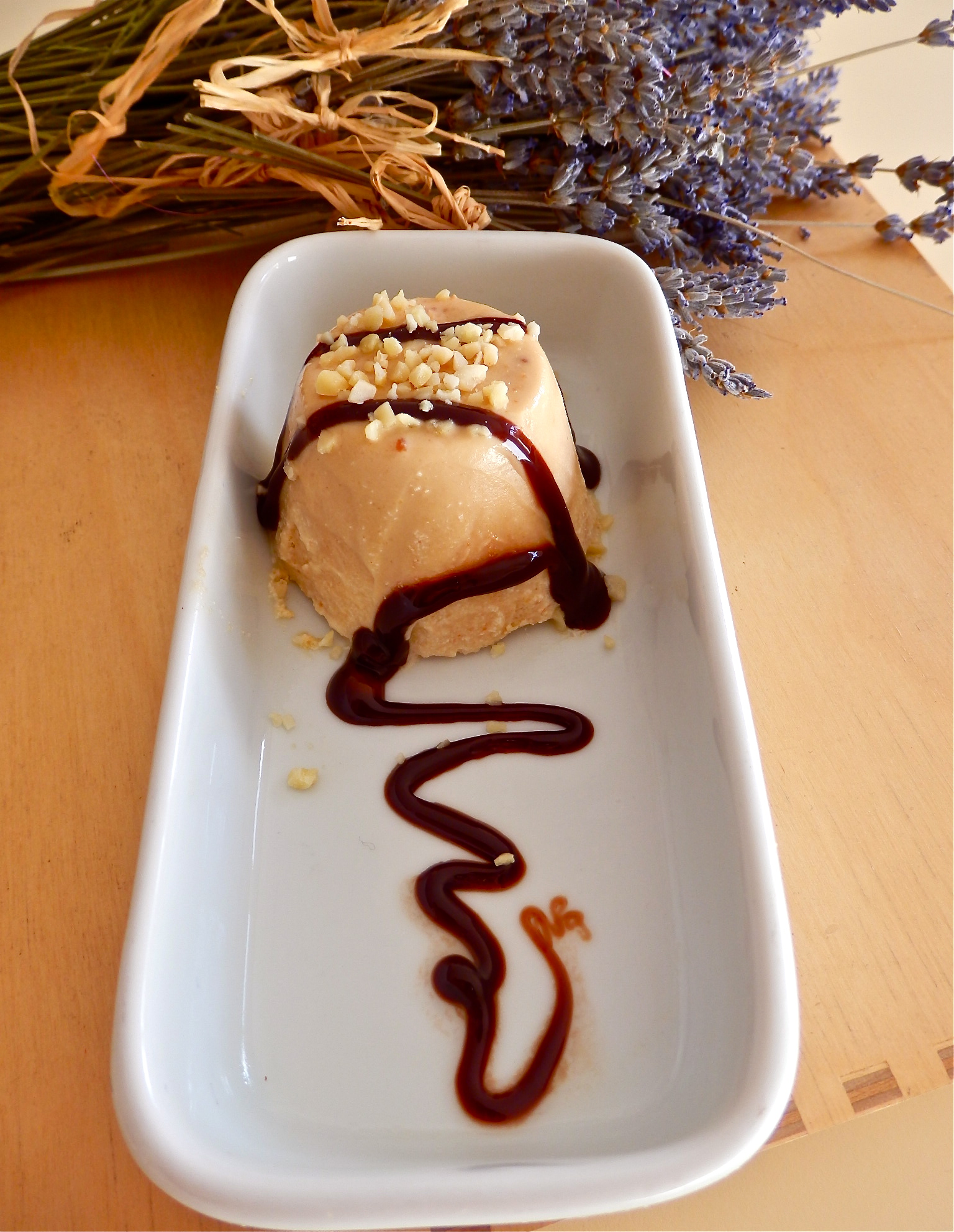 6. Desmolda quince minutos antes de consumir. Decora con caramelo líquido y almendras picadas o con briznas de turrón y sirve.