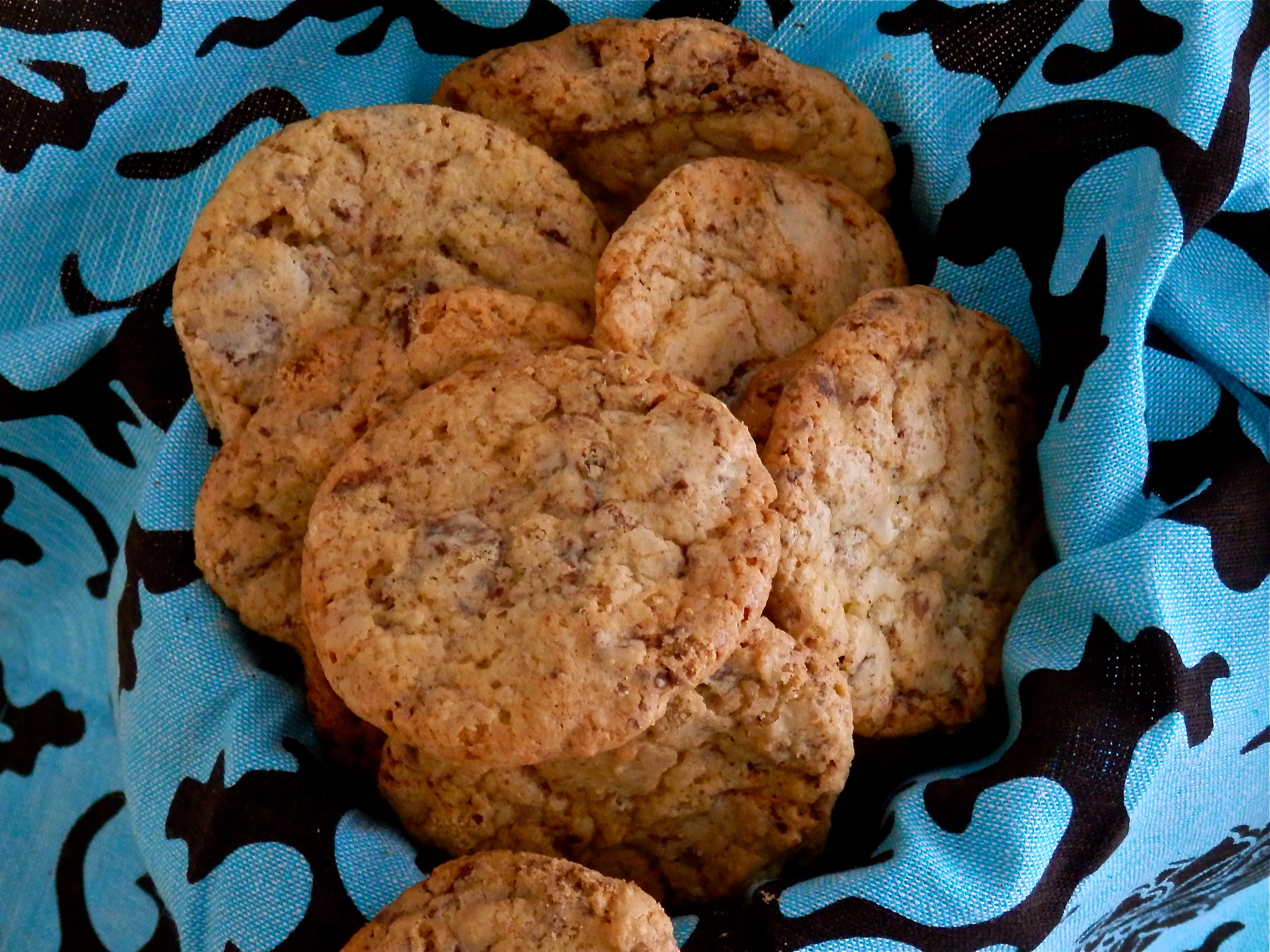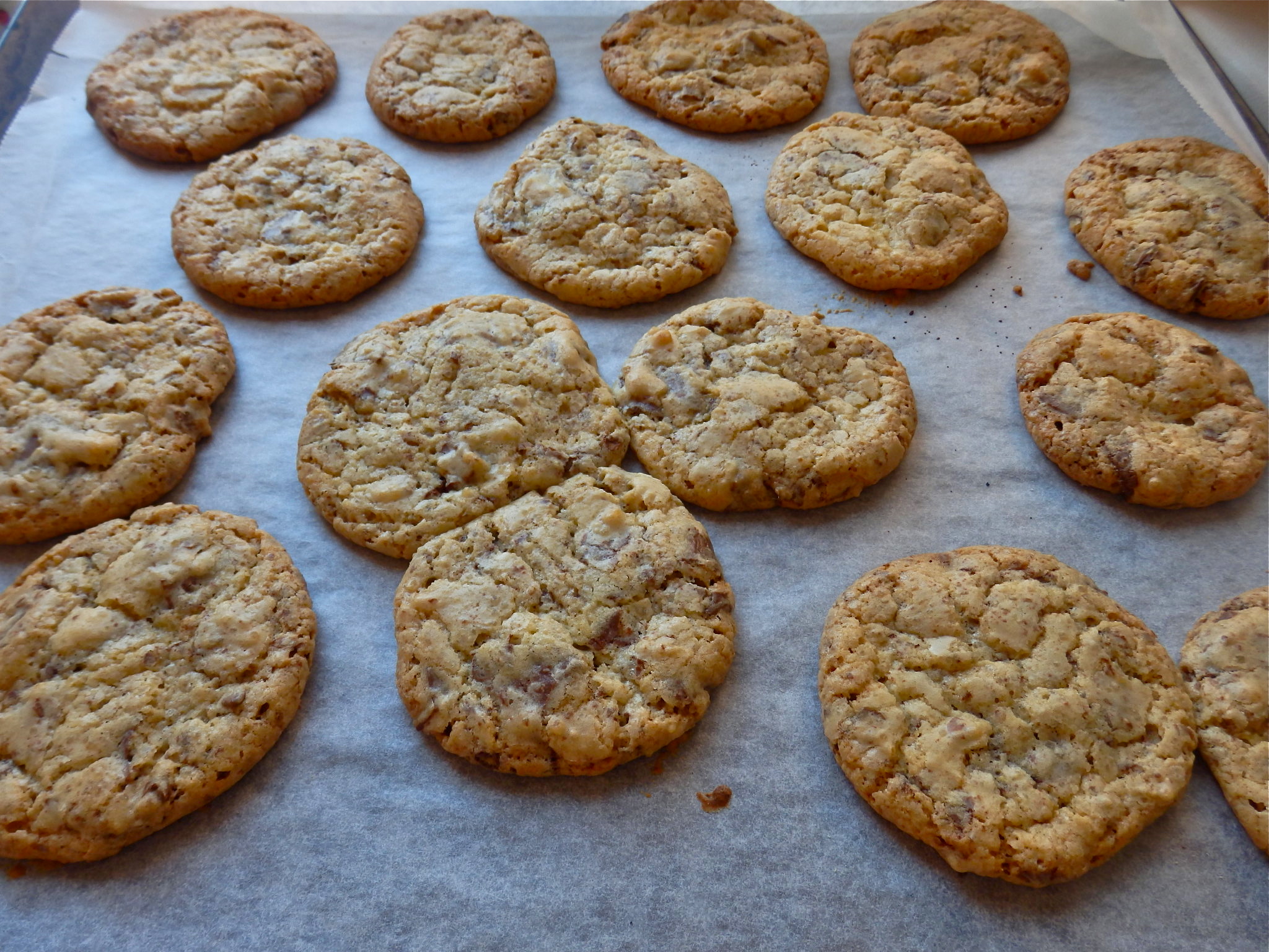 Tuve que pelearme un poco con el chocolate, bien es verdad, porque no tenía las fantásticas gotitas de chocolate que ahora encuentras en los supermercados de moda. Pero la pelea a brazo partido con la tableta mereció la pena y al cabo de una hora tenía a mi alcance más de cuarenta auténticas Chocolate chip cookies y un aroma de chocolate y vainilla viajando por toda la casa.