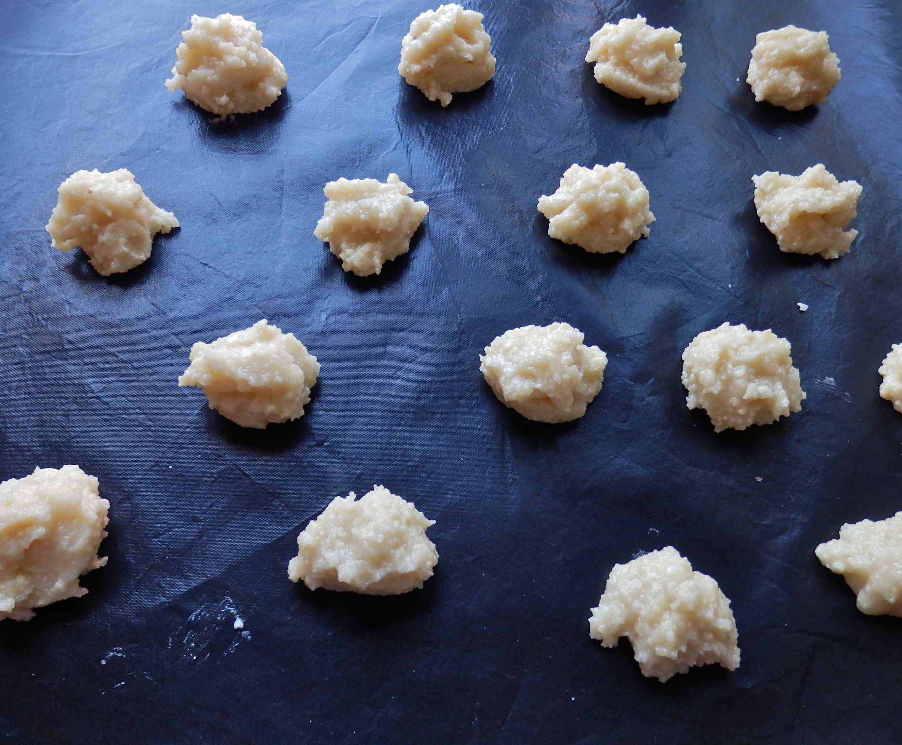 - Formar bolitas y disponerlas en dos bandejas de horno cubiertas con papel de hornear. Salen unas 30-35 pastas.