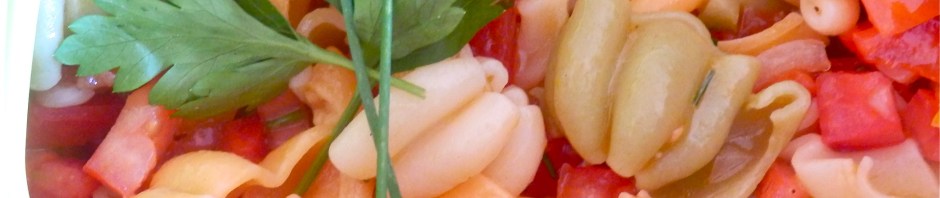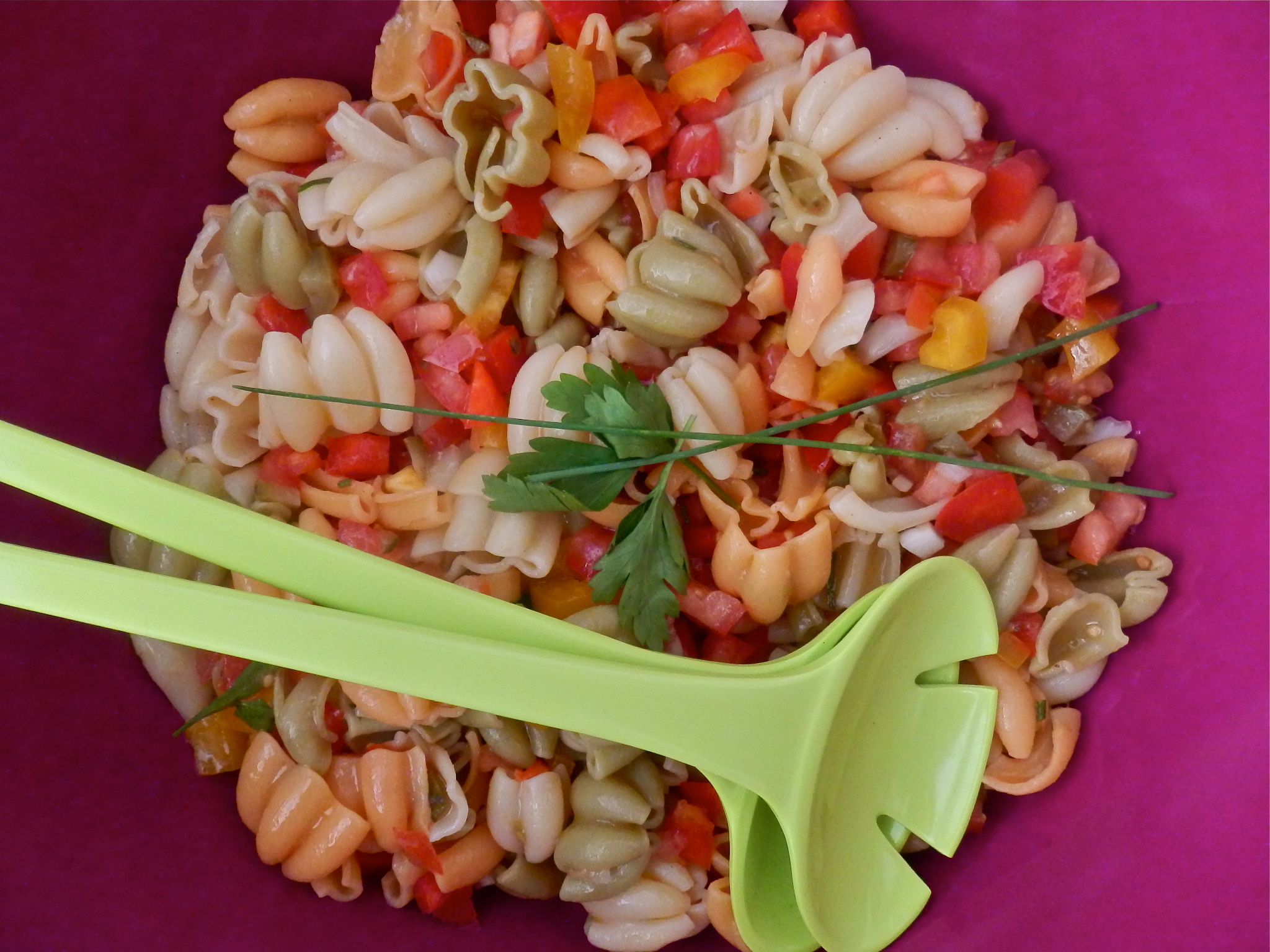 Esta ensalada de pasta es el resultado de un día de nevera vacía, en que fui reuniendo retales para conseguir algo que llevar a la boca de mis criaturas: la pasta cocida que había sobrado, un trozo recuperado de pimiento rojo, un enorme tomate solitario, la última cebolla del cesto, unos pepinillos en vinagre que llevaban varios meses sin decir ni mu en el refrigerador y, ¡ah, sorpresa!, unas anchoas en aceite que dormían benditamente el sueño de los justos junto a la mantequilla. Aliñado todo con finas hierbas y un buen aceite de oliva, al día siguiente hubo pelea por los restos.