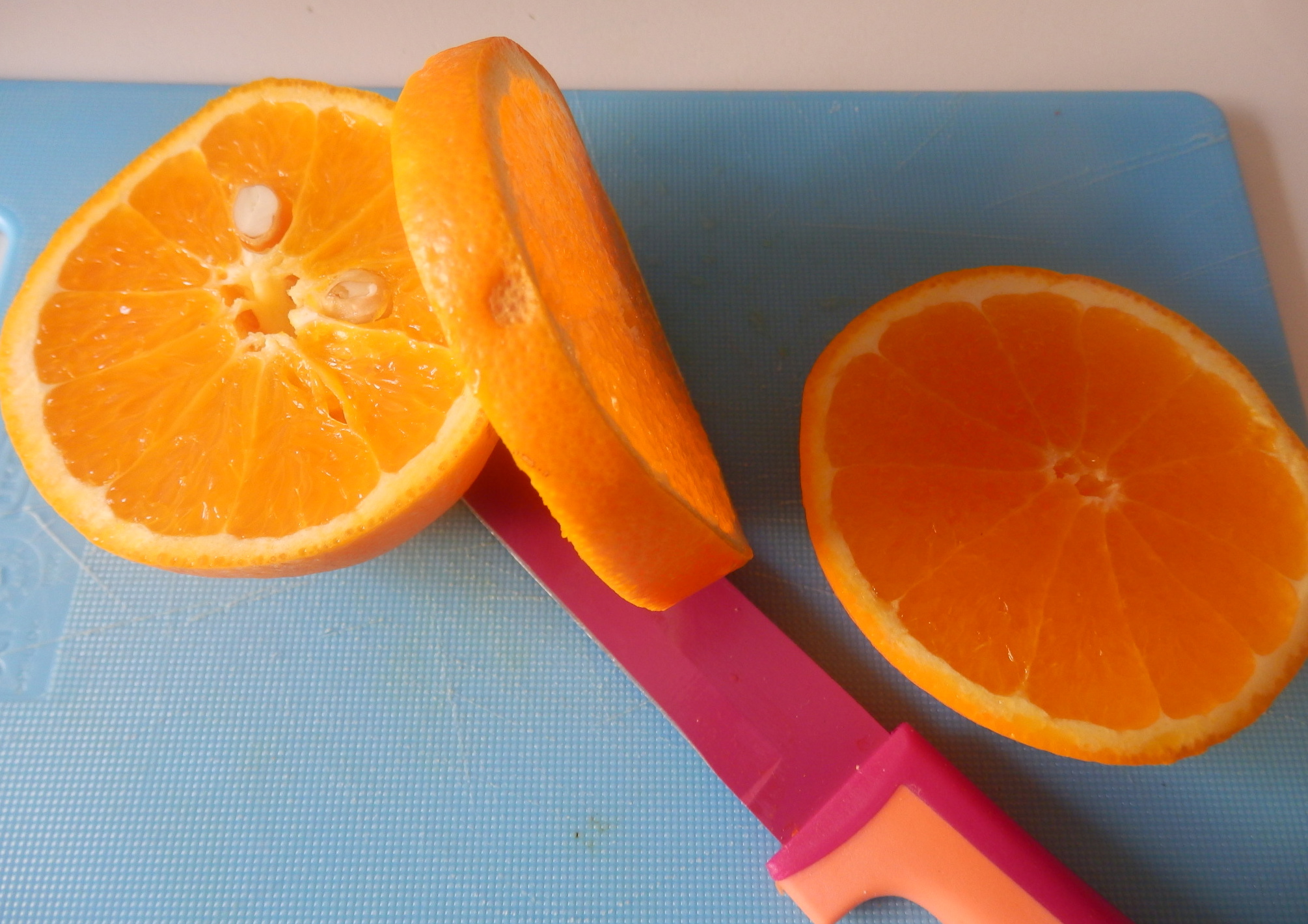 - Cortar la naranja por la mitad y cortar a su vez una rodaja de la parte central para adornar la jarra. Con el resto, hacer zumo y añadirlo al té.