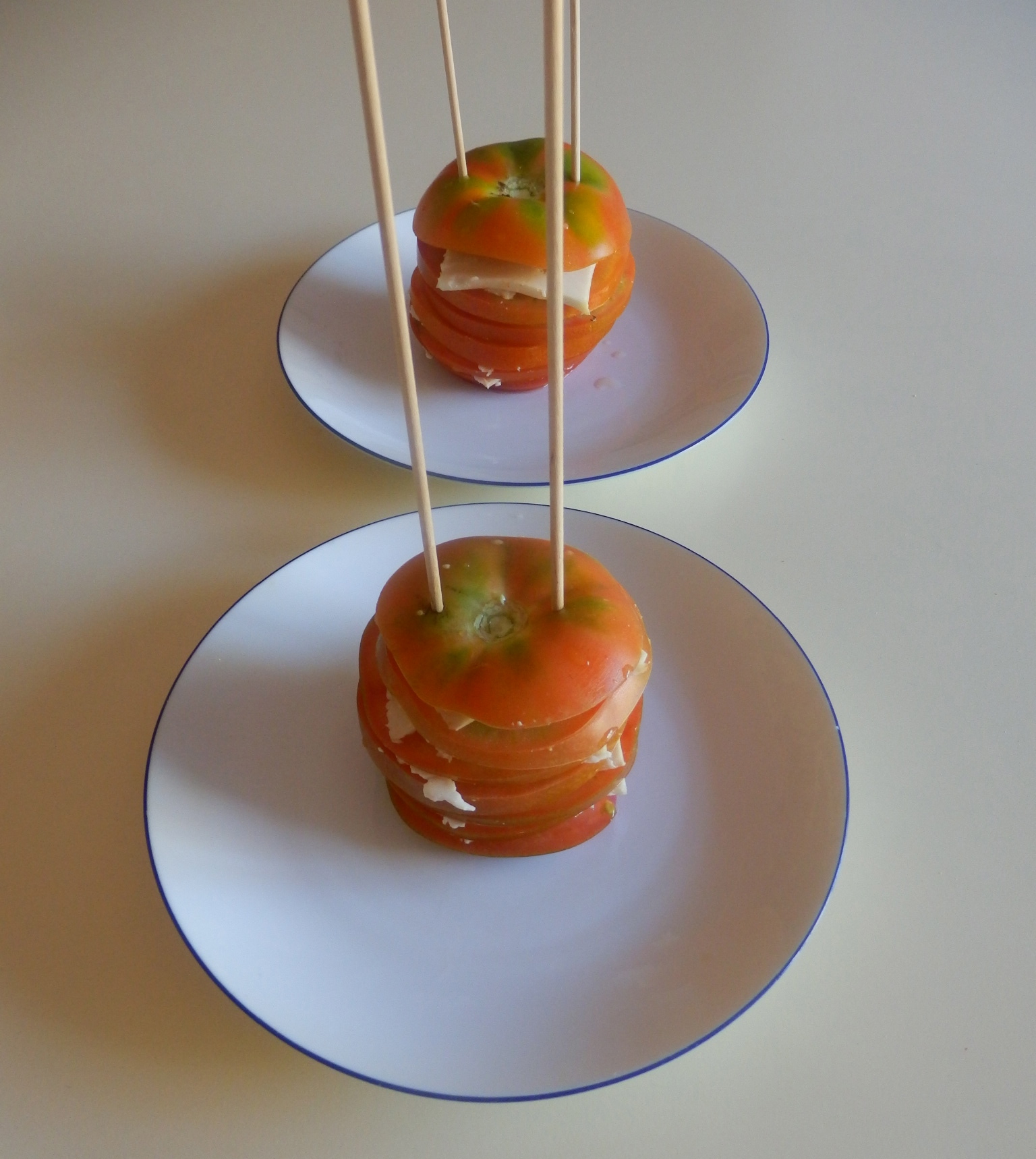 Terminar con la última rodajita de tomate. No utilices la primera rodaja de tomate y así haces la base para que se sostenga equilibradamente. Pincharlo con dos brochetas o palillos largos y disponer cada tomate en el plato de servir.