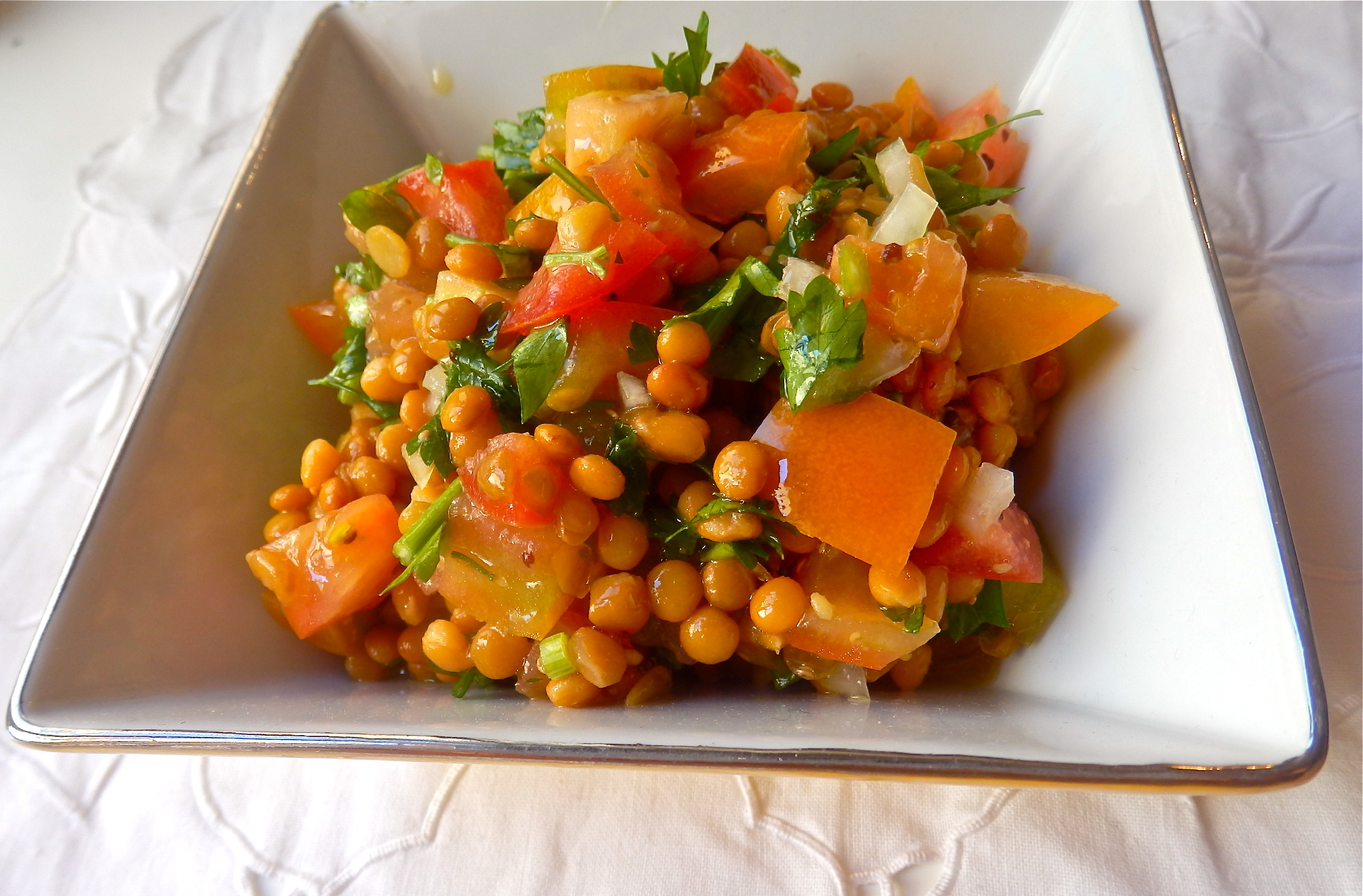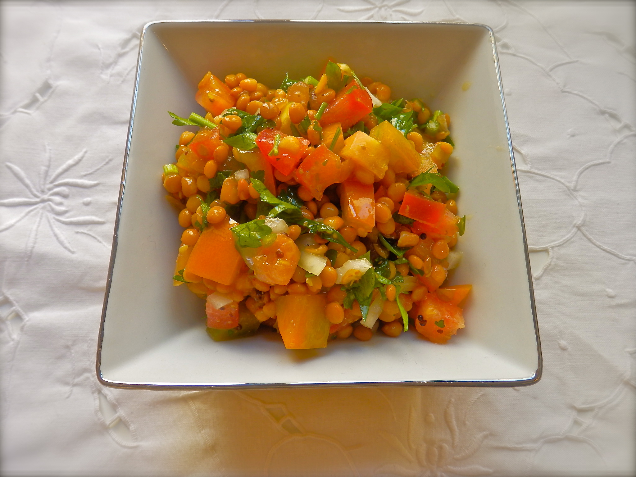 Refrescante ensalada cargada de proteínas y de sabores mediterráneos. Como no precisa cocción, se presta a realizarlo en esos días en que el calor apenas permite respirar y nos deja abatidos por la pereza. Como tiene contundencia, puede considerarse un plato casi único combinado con un buen fiambre o con pan auténtico.