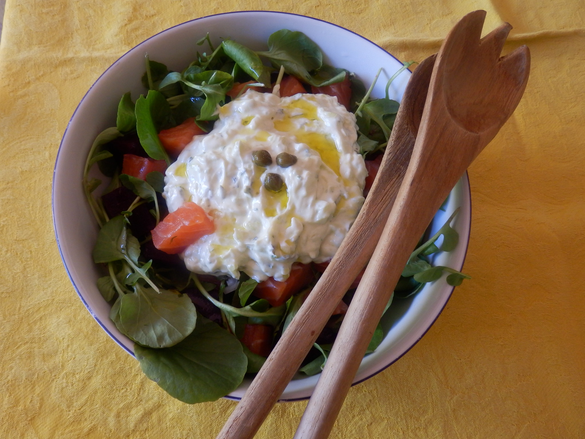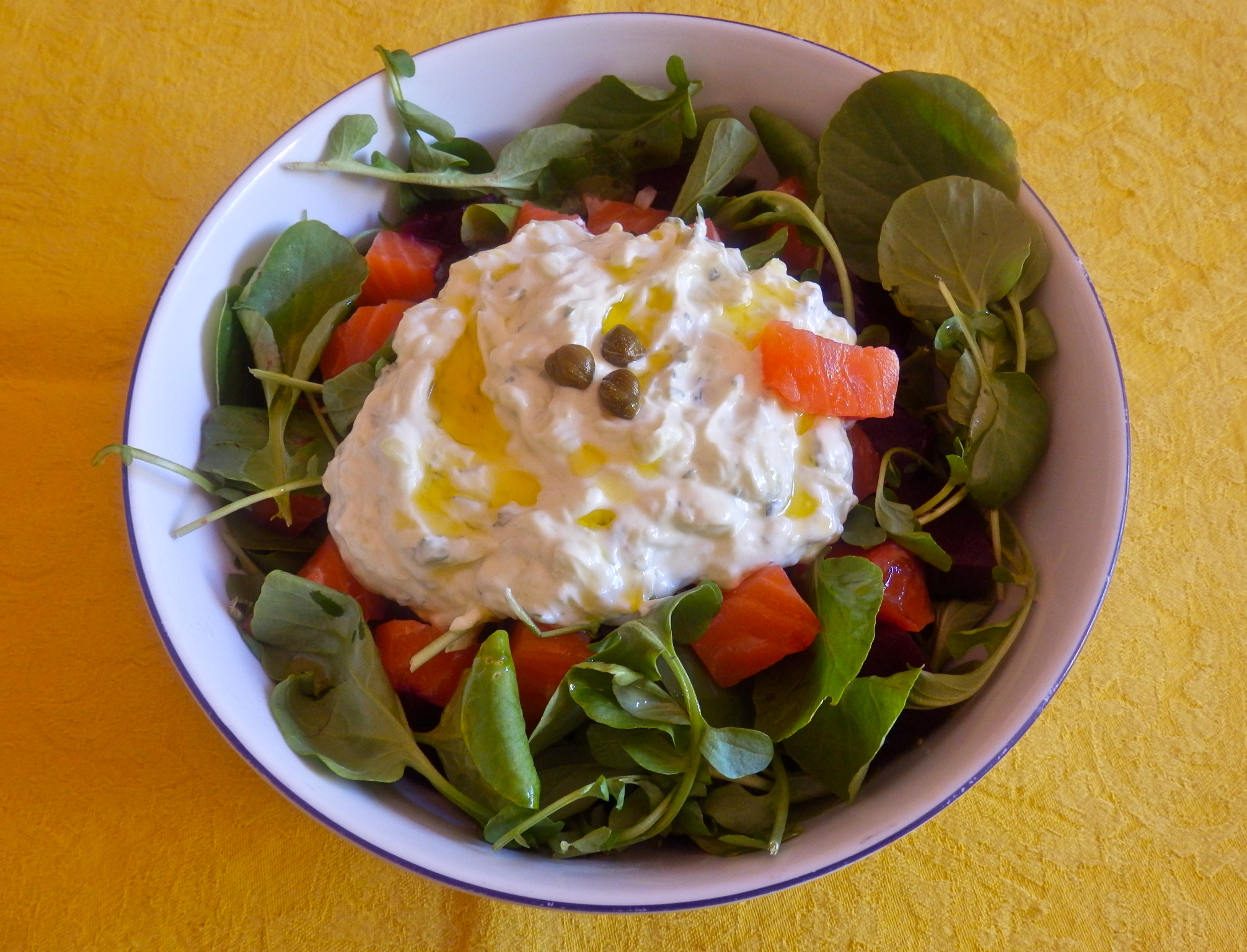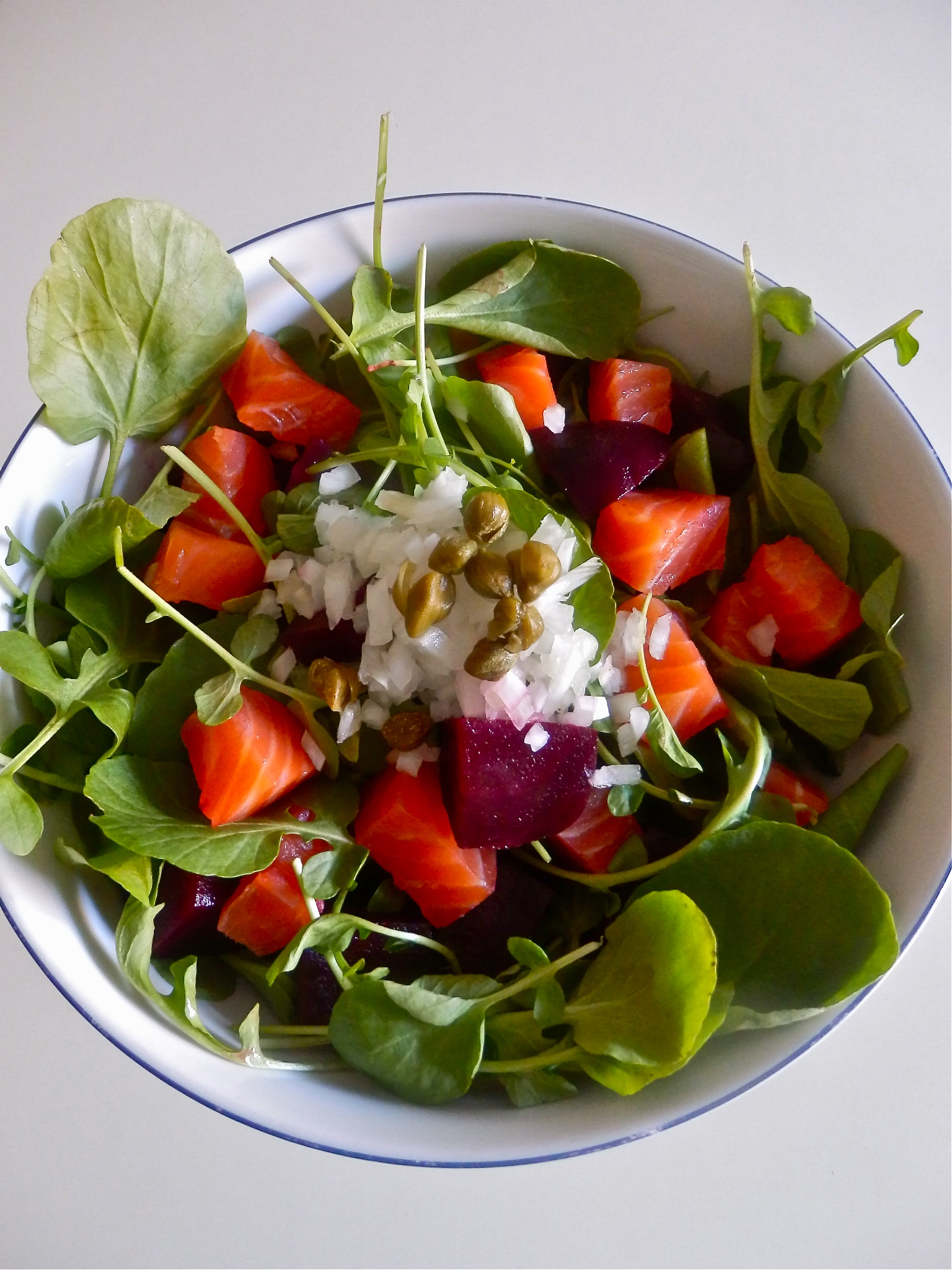 Esta receta surgió de La enciclopedia de los sabores, un delicioso libro de Niki Segnit que recibí por mi cumpleaños. En su aliento a la creatividad del cocinero, la autora propone una combinación de los diferentes grupos de sabores para que el cocinero pueda jugar y descubrir platos como esta ensalada. Encontré unos berros fresquísimos y compré salmón ahumado para acompañarlos. Y en el libro descubrí que la remolacha, sí, la remolacha, combinaba bien con los ahumados. Así que me lancé a la mezcla y claro, no podía faltar la neutralización del yogur y bañé con tzatziki todos los ingredientes.
