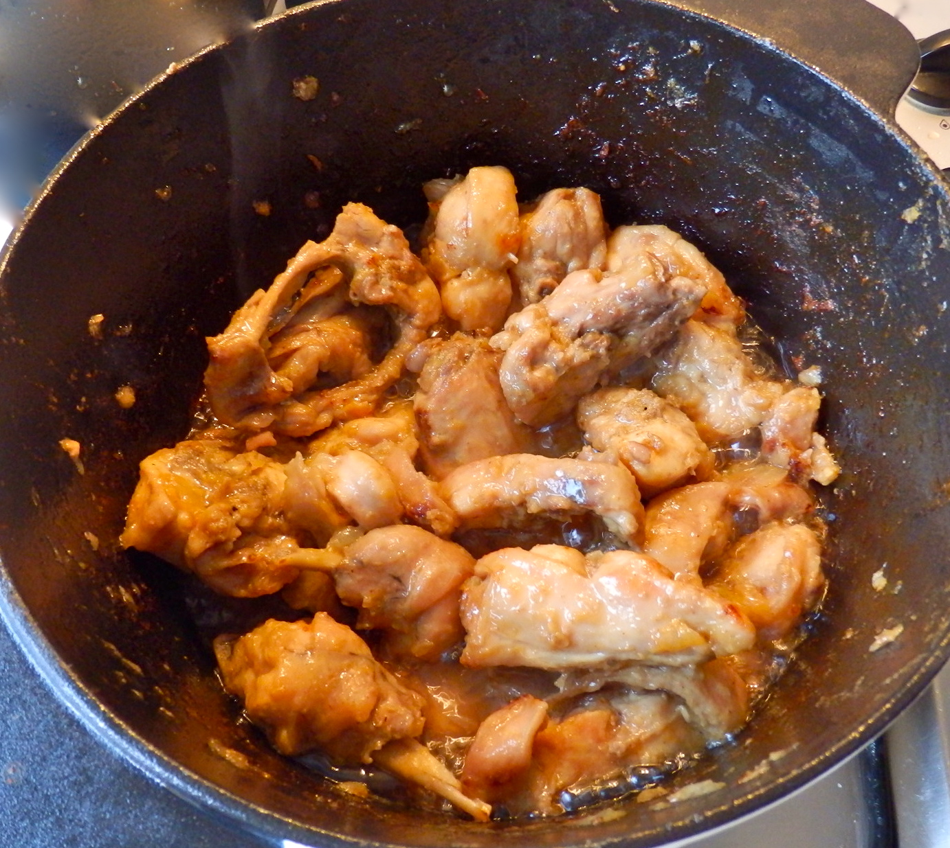 - En una cazuela de fondo grueso, rehogar el conejo con la manteca/aceite y la cebolla.