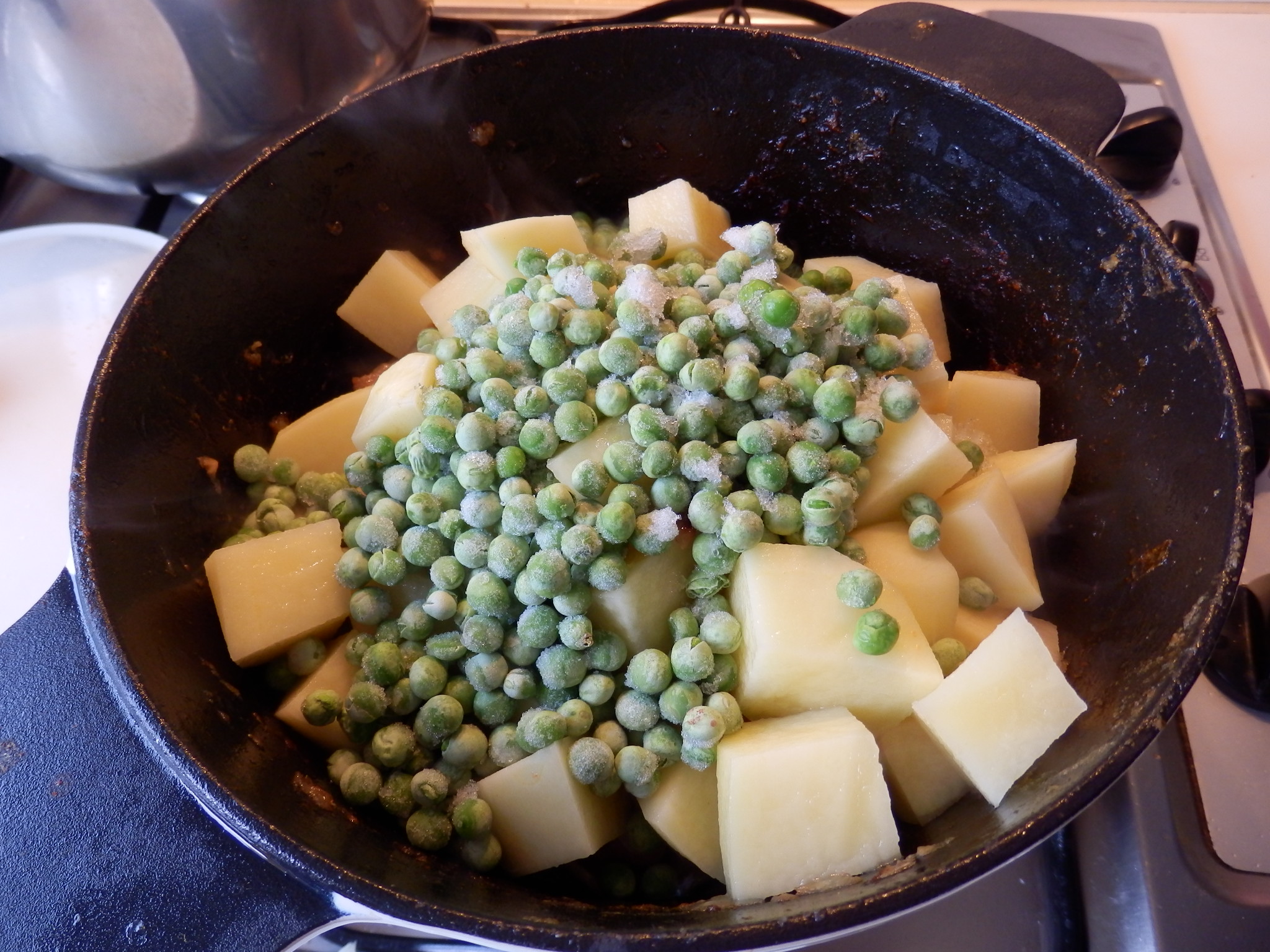 - Añadir las patatas y guisantes y saltear otros dos minutos más antes de añadir el caldo.