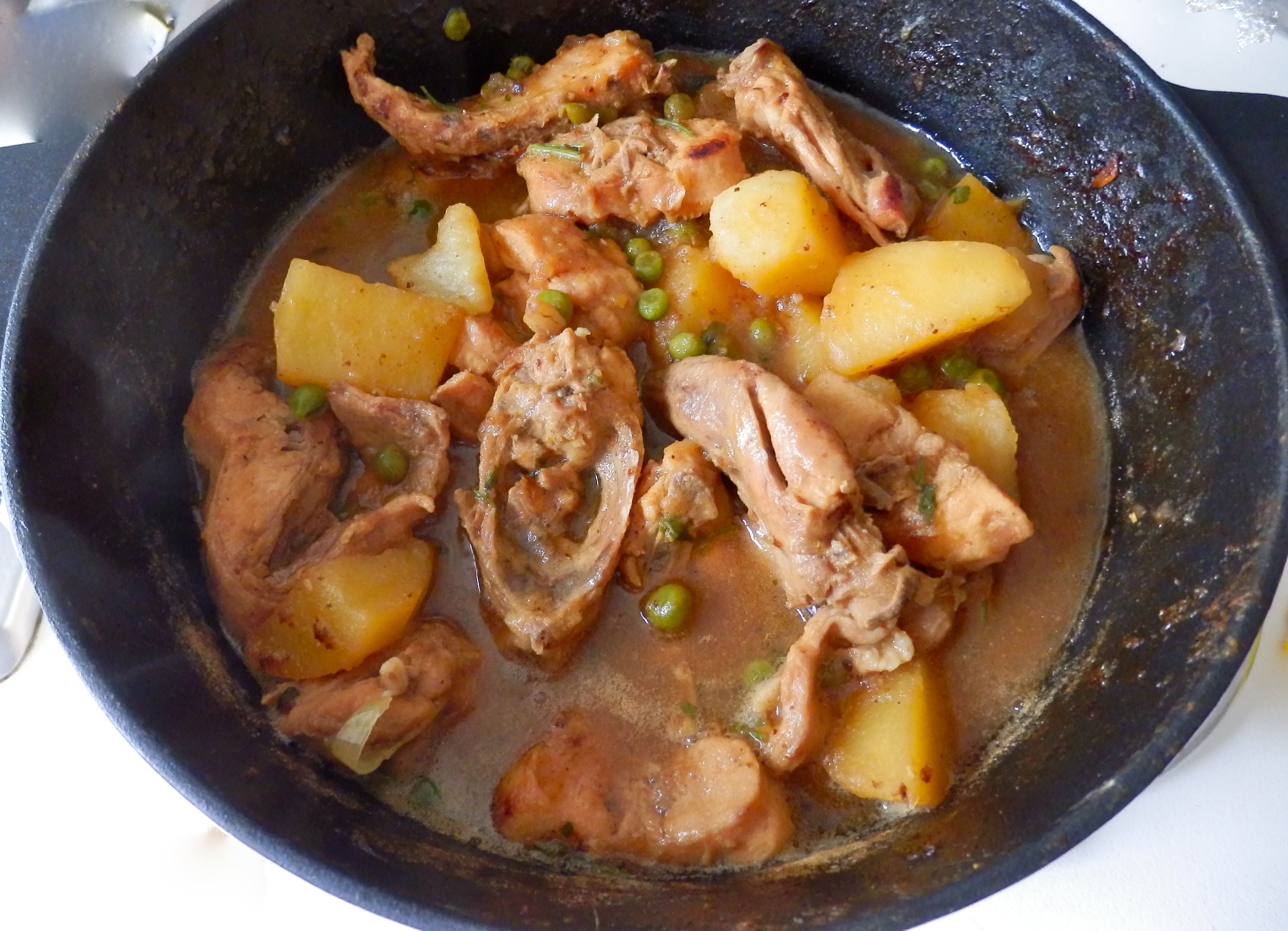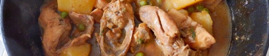 Aparte de la famosa versión del conejo al ajillo, yo no conocía ninguna otra manera de preparar el conejo de granja hasta que, cómo no, Mercedes bajó con su platito humeante. Ésta es su versión, así que ignoro la procedencia de la receta. Lo único que puedo asegurar es que la rápida preparación y la economía de los ingredientes no desmerecen el sabor del guiso.