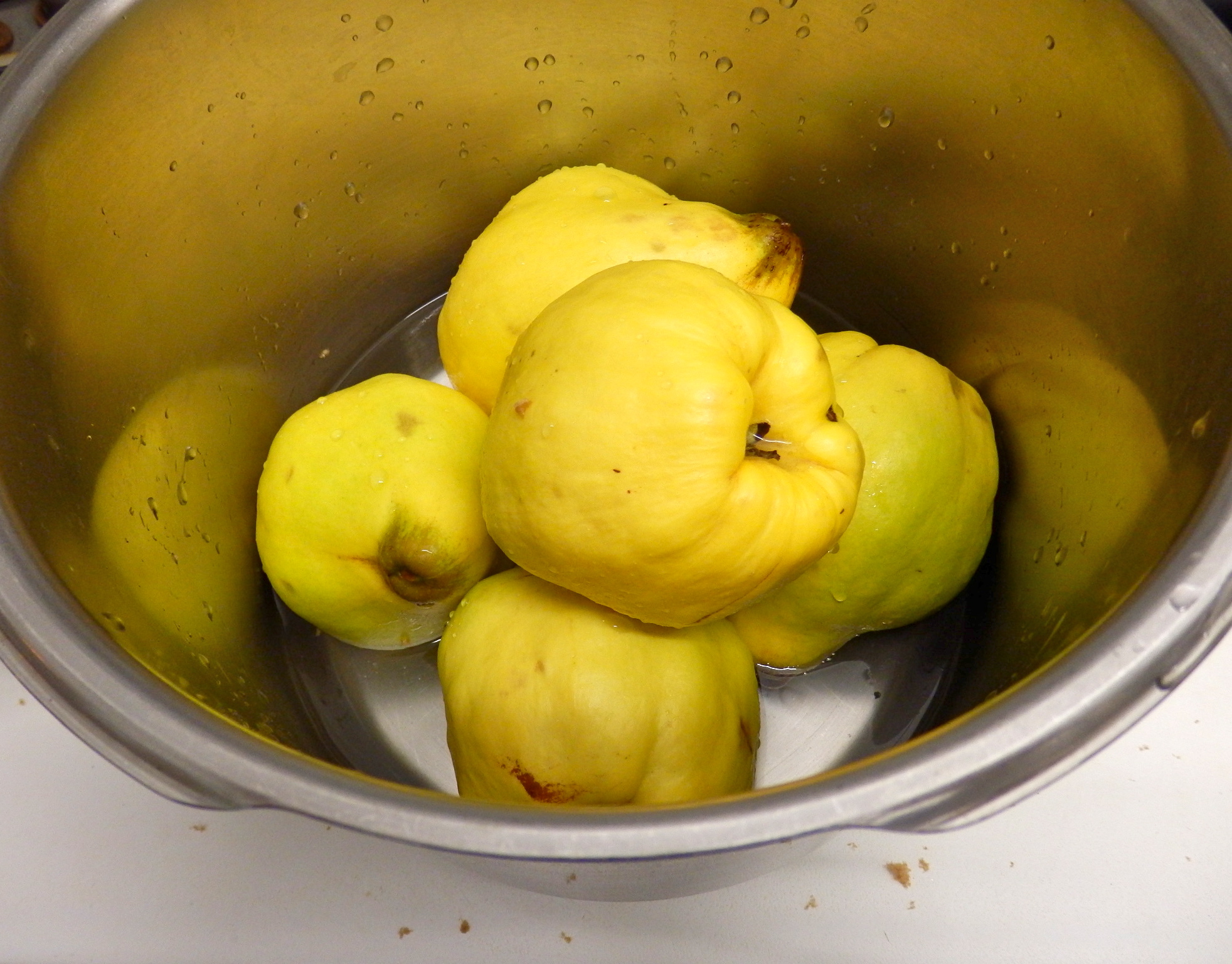 - Quitar la pelusilla de los membrillos con un cepillo y lavarlos. Ponerlos a cocer con el agua en la olla a presión (5 minutos en la superrápida, 12 en la tradicional, 1 hora en cazuela normal).