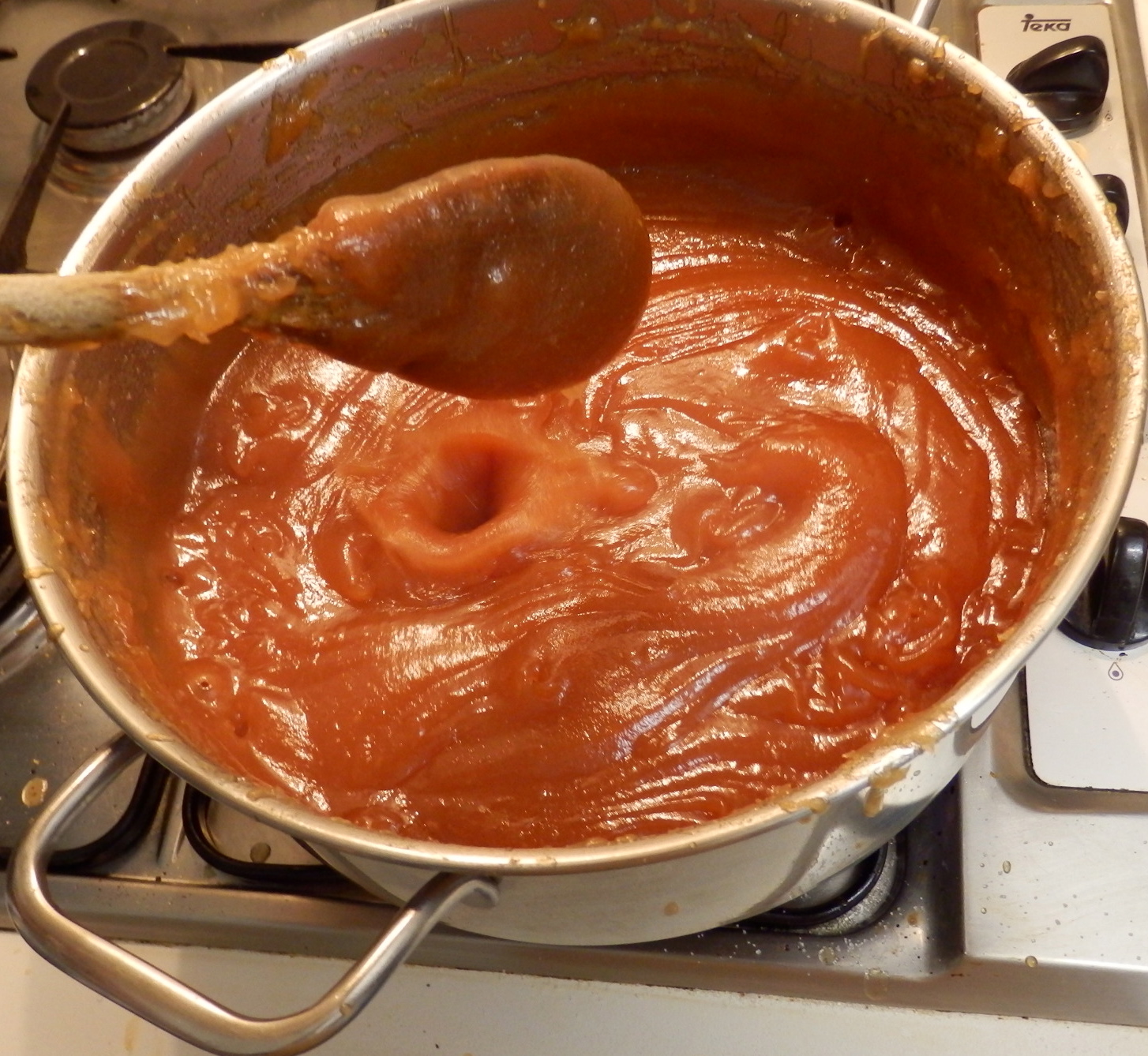Pues lo hice en el programa de mermeladas pero tuve que hacerlo en dos tandas, dos veces el programa porque habia micha cantidad. De vez en cuanto removia con la espatula y no salpico nada porque la temperatura la mantiene bien. Yo siempre lo hacia a mano pero ahora ya lo hace la pani