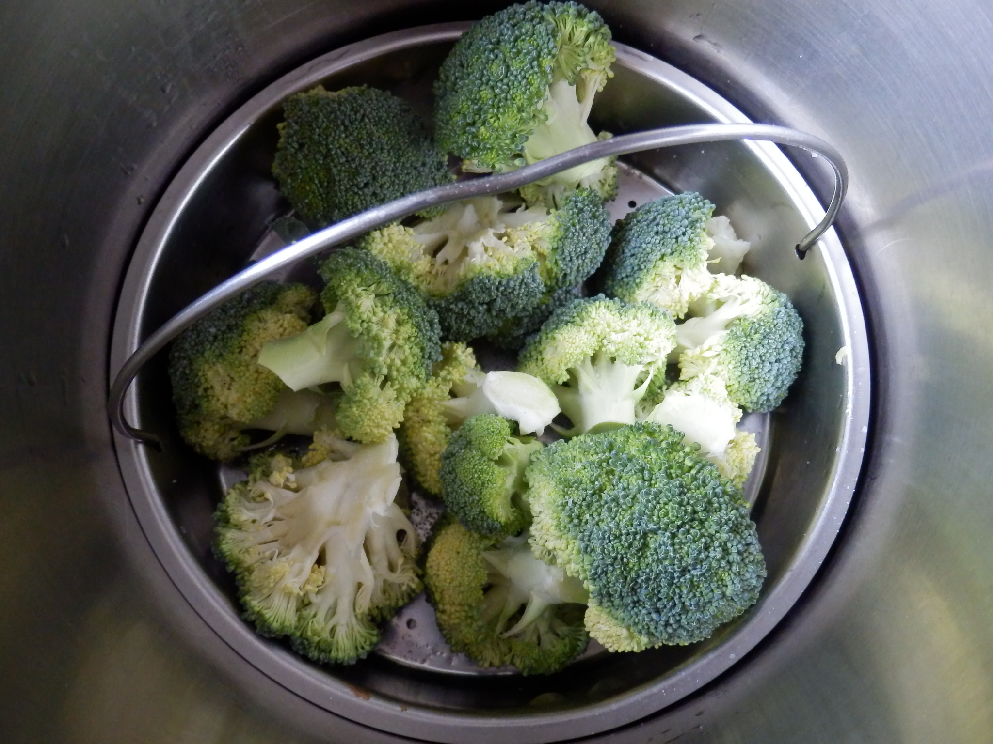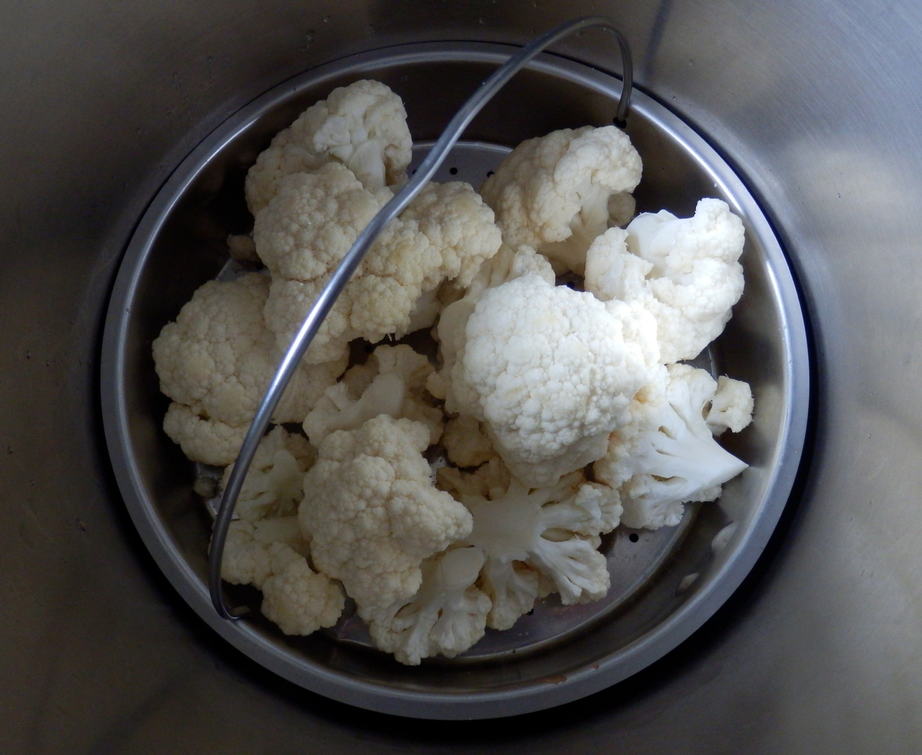 - Cocerlas en un cestillo de vapor poniendo 150 cc de agua en la olla a presión y depositando el cestillo con los ramitos de coliflor salpimentados. Contar 4 minutos desde que aparezca la primera raya de la válvula y enfriar bajo el grifo. Repetir lo mismo con el brécol aprovechando el agua de hervir la coliflor.