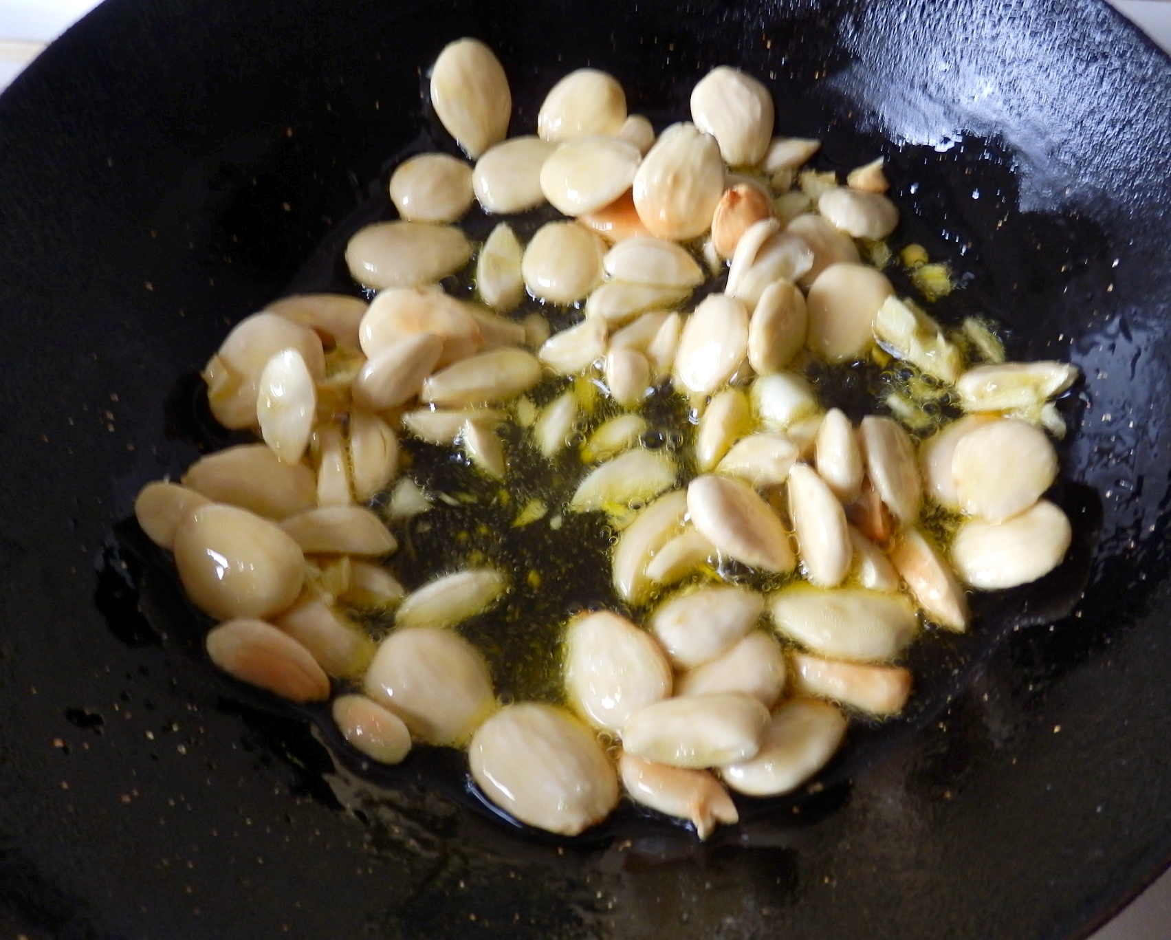 - Dorar el ajo picado en una sartén con el aceite y las almendras algo picadas. Vigilar porque se queman sin apenas darte cuenta.