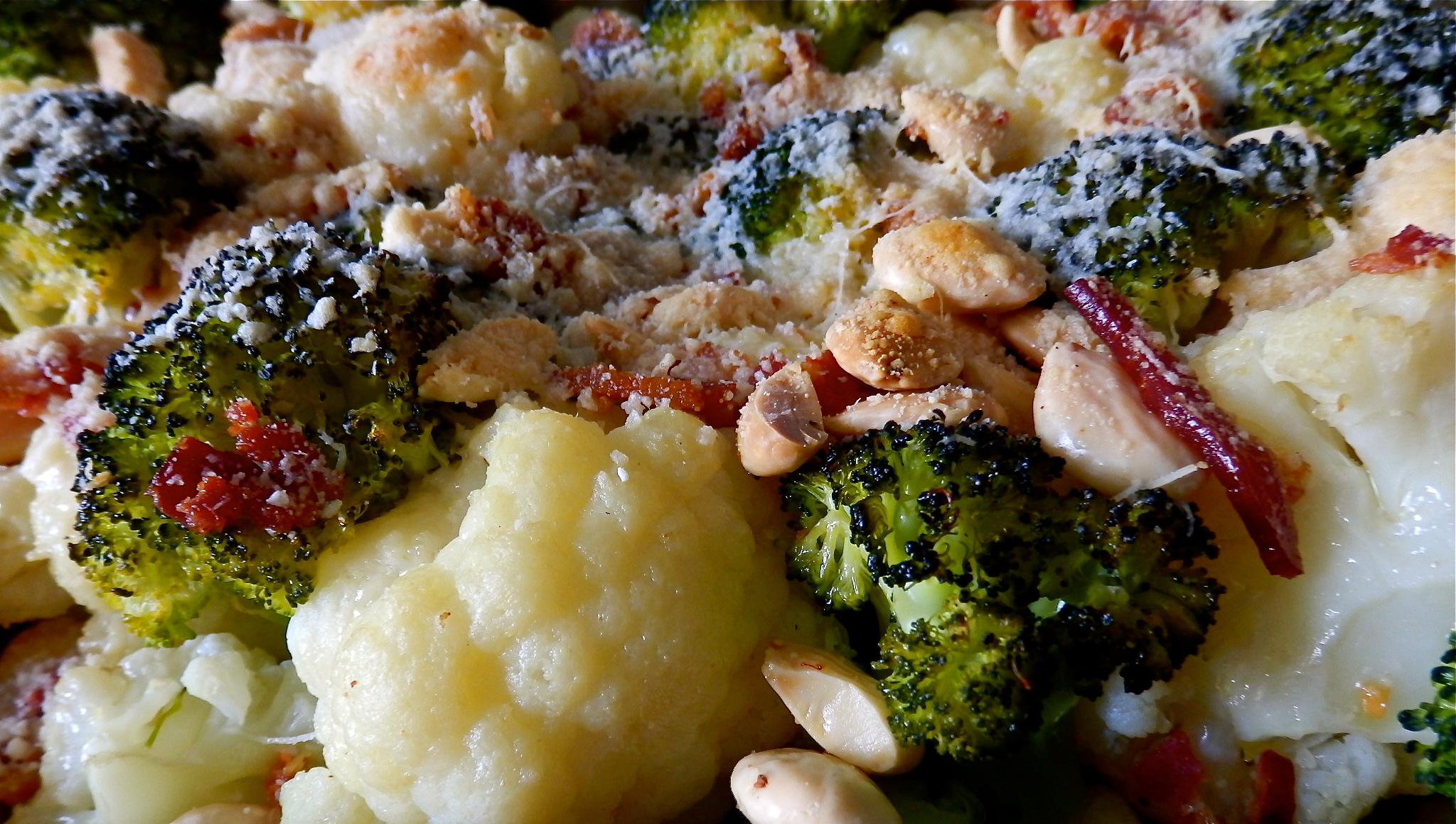 Para los alérgicos al campo y amantes de la naturaleza, también hay un rinconcito en este blog y les traemos un bosquecillo en miniatura. Primero tendrán que cerrar los ojos, dejarse llevar por el aroma, luego por el sabor y finalmente sorprenderse por el inquietante crujir de las texturas. Este plato empezó siendo vegetariano pero poco a poco se fue contaminando por las bestialidades del bacon frito y del parmesano. El resultado es magnífico siempre que los ingredientes sean frescos: el color y el sabor de la coliflor y el brécol han de ser impactantes, casi como arbolitos de navidad, unos nevados y otros no. El rojo del bacon, si te decides a ponerlo, ha de ser apenas perceptible, solo chispeante. Y no lo inundes de queso para fundir, deja que el parmesano le preste su toque picante sin bañarlo en grasa.
