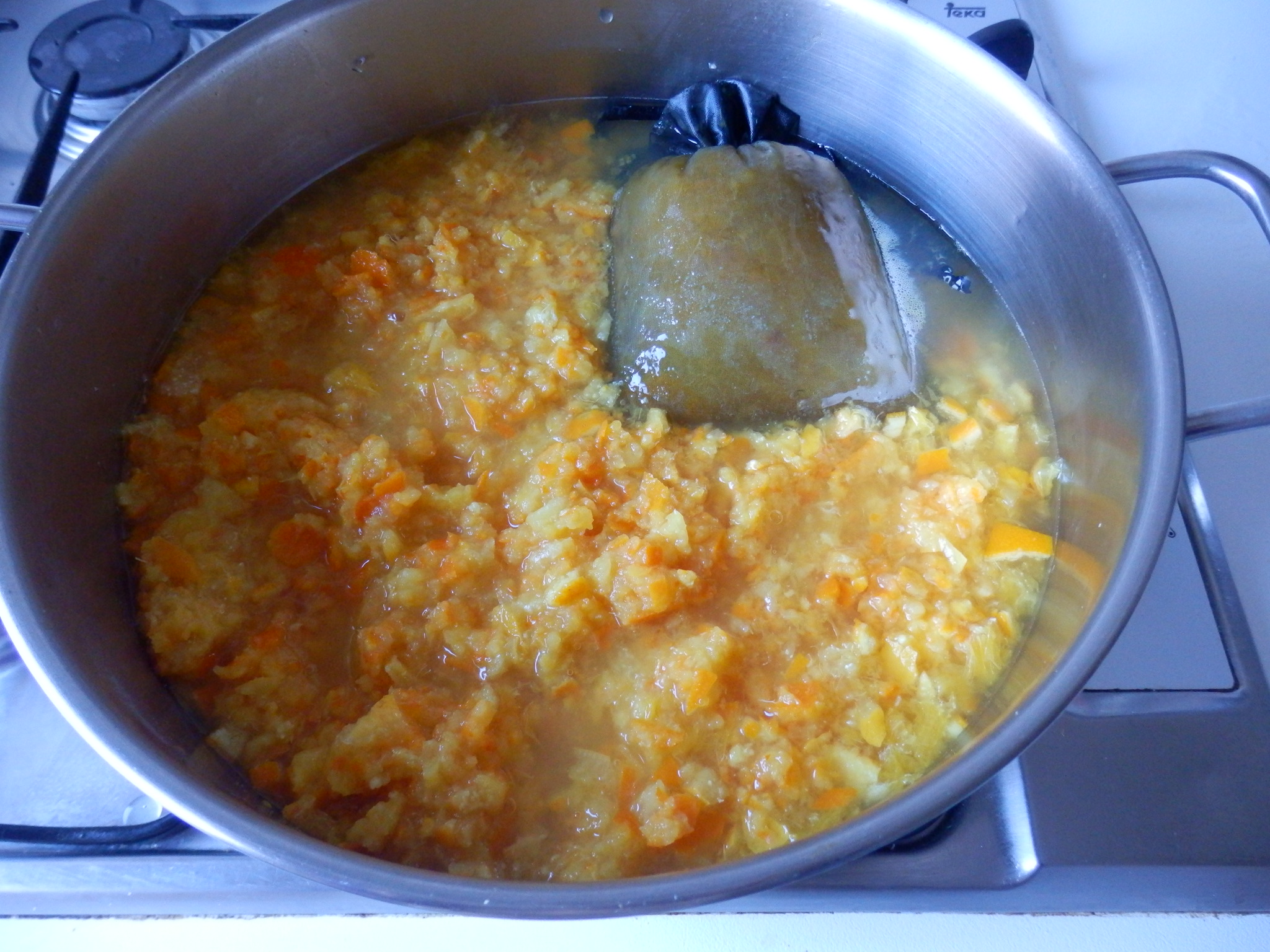 - Poner toda esta picada en el agua reservada, añadiendo la gasa con las pepitas y la pulpa de los cítricos agrios.