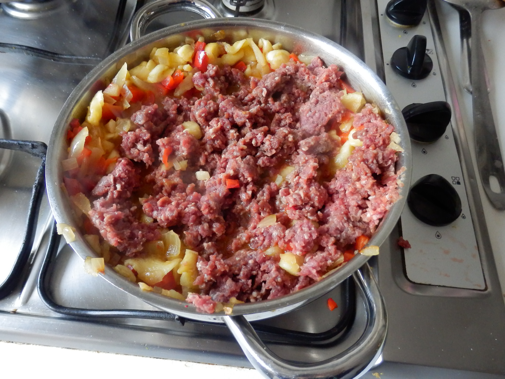 - En una sartén grande pochar la cebolla junto con el ajo en el aceite. Cuando esté la cebolla casi dorada, añadir el pimiento, la pulpa de los calabacines y la carne, salteando durante unos cinco minutos.