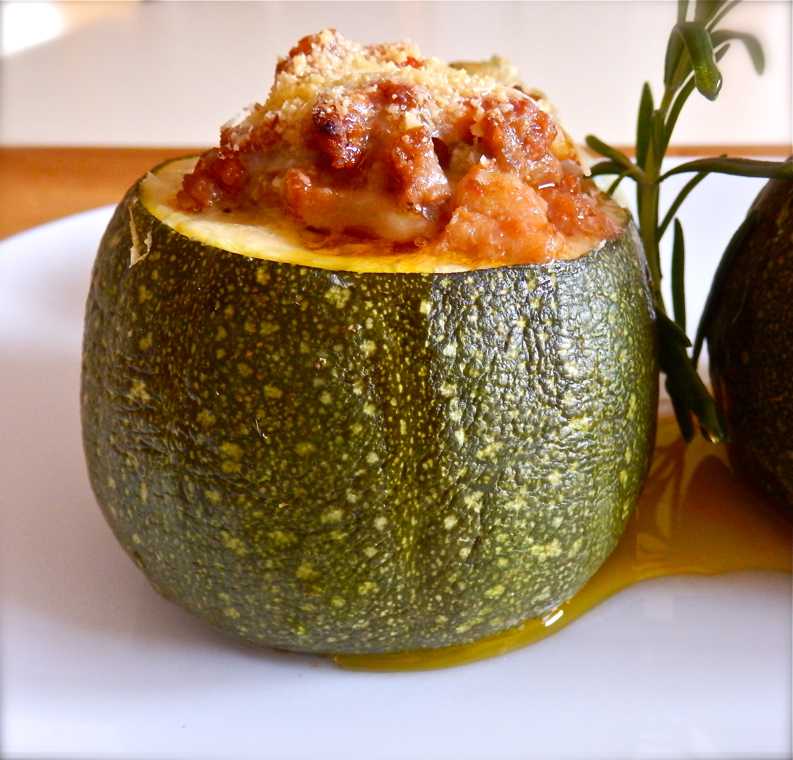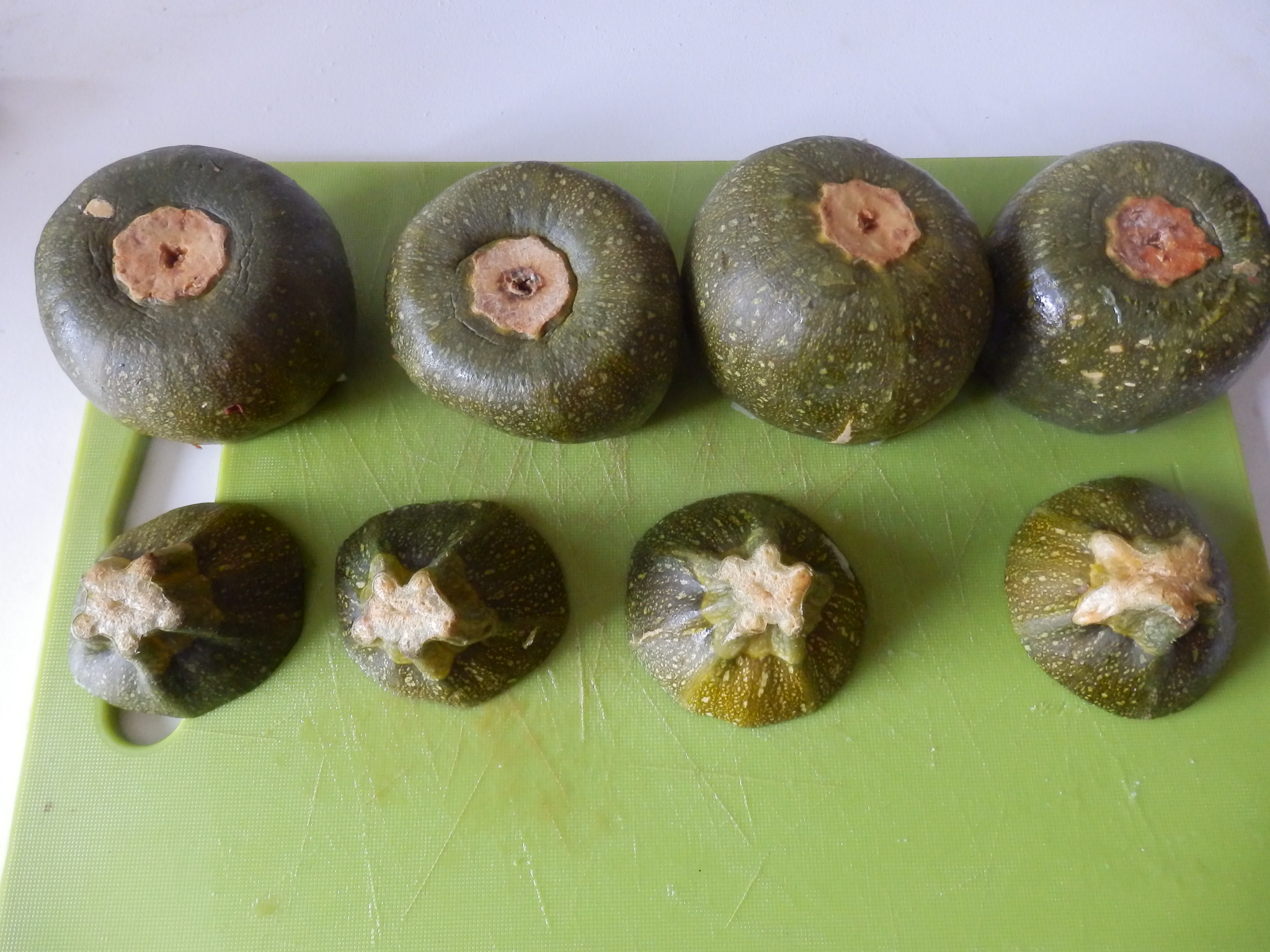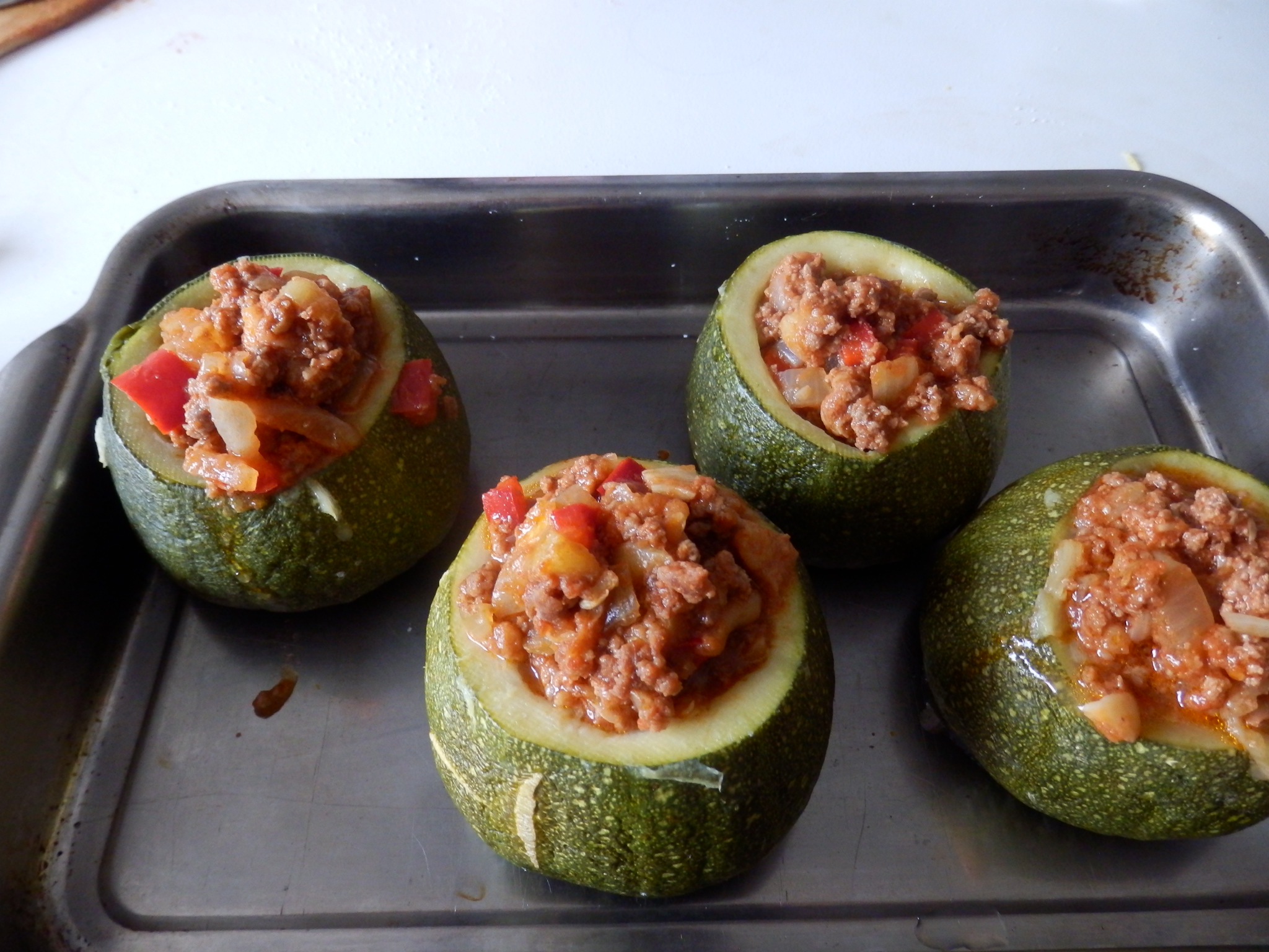 Nunca había visto unos calabacines tan bonitos como los que trajo mi amiga Marga el otro día. Semanas antes había preparado ella estas preciosidades con un aspecto tentador y tuvo el detalle de pasarme la receta. Junto con media docena de calabacines. Se pueden utilizar calabacines normales, los grandes, cortados en trozos y vaciados en su interior pero sin tocar el fondo. El punto está en conseguir la textura adecuada para que sostengan el relleno sin que resulten duros e indigestos.