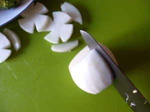 - Pela, lava y corta las verduras. Puedes cortar los nabos y zanahorias con motivos decorativos:
