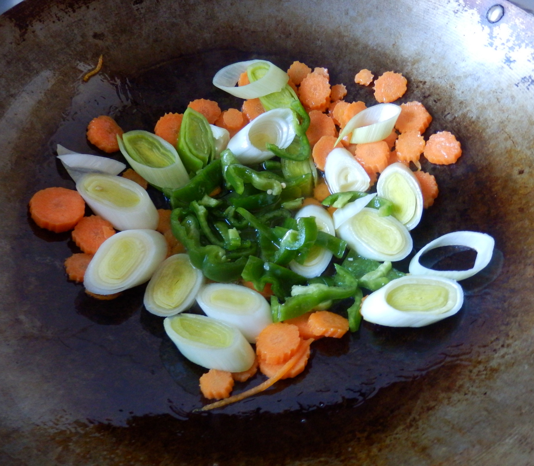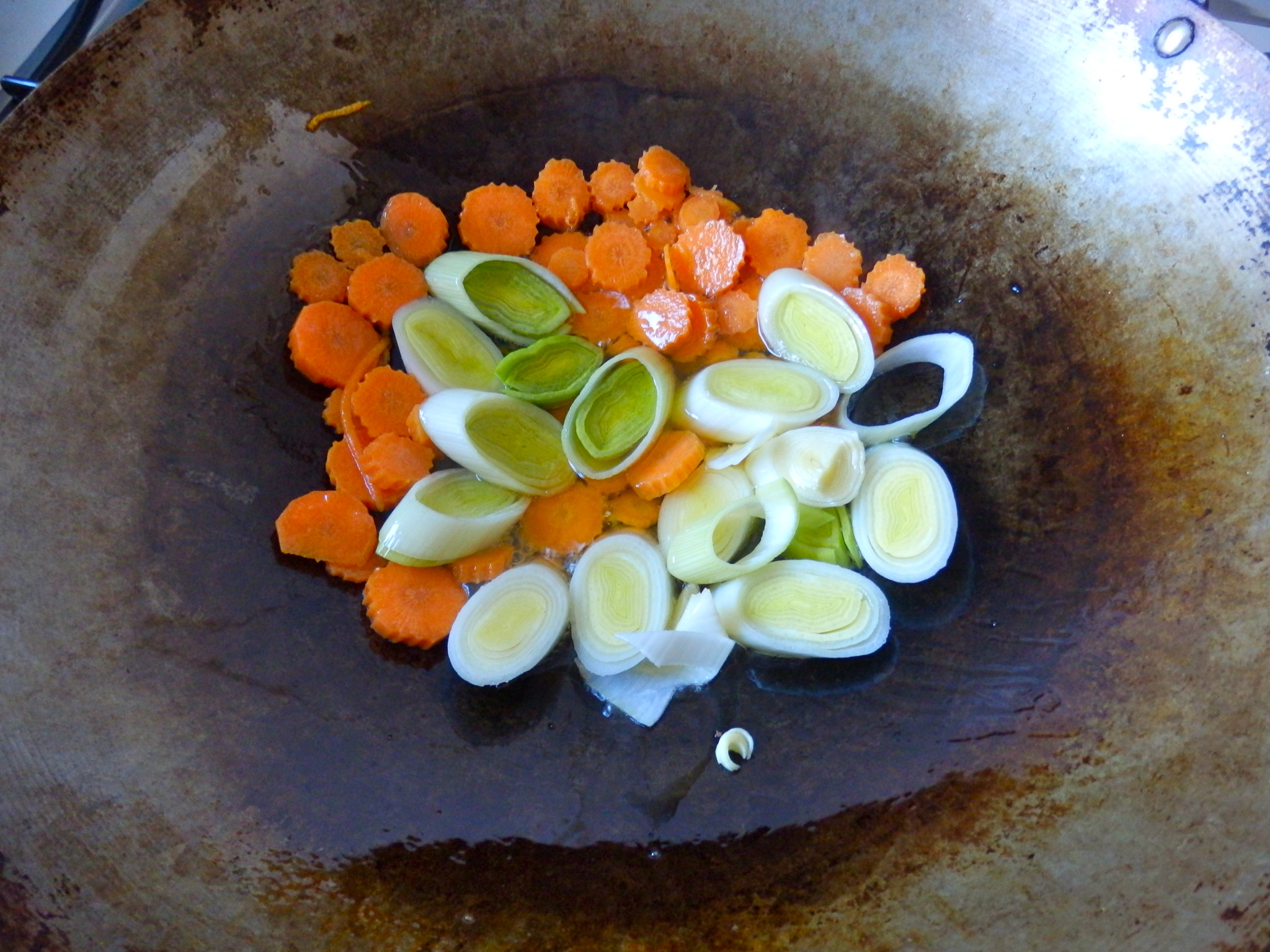 - Antes de que pase un minuto, añade los puerros en el centro del wok y aleja la zanahoria del centro. De esta manera, se sigue cocinando «a la plancha» en las paredes del wok, pero sin el calor intenso que hay en el centro.