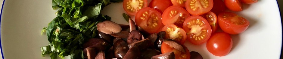 - Cortar la albahaca en tiras finas, partir las aceitunas y los tomatitos en dos.